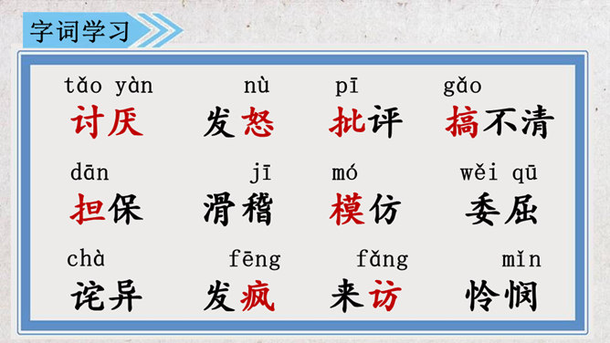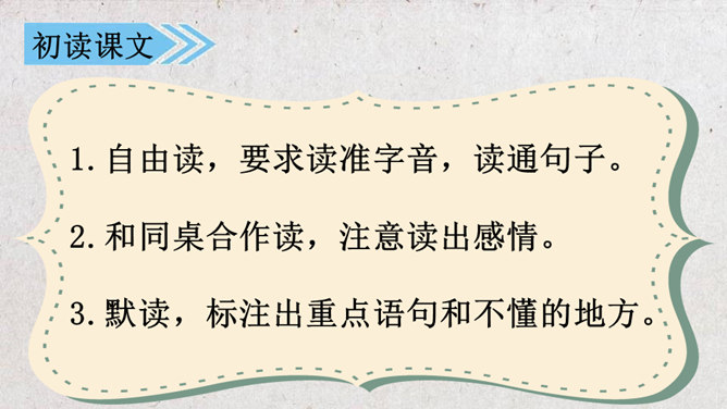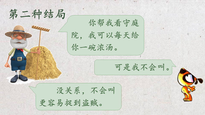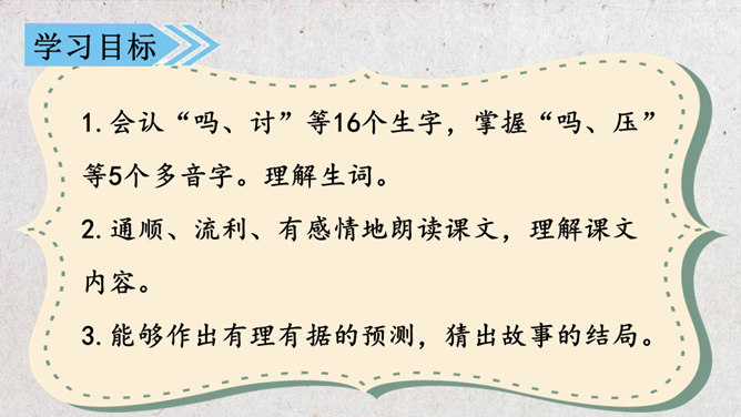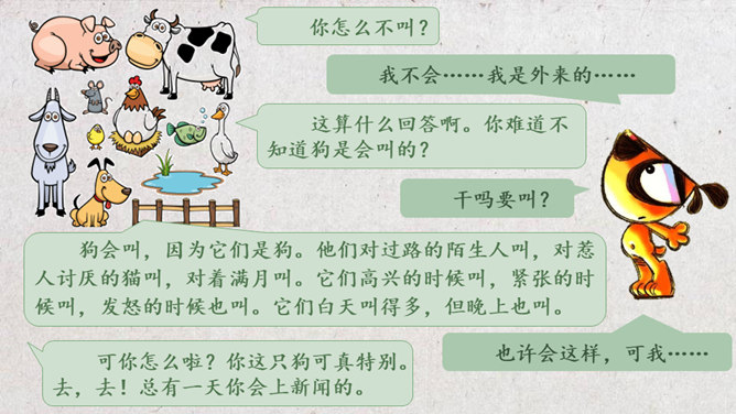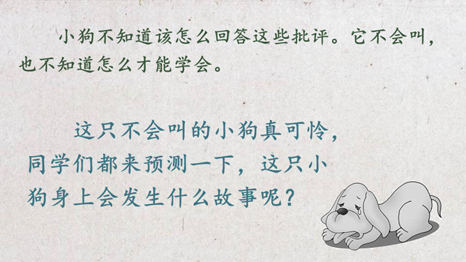 学习目标:1.会认“吗、讨”等16个生字,掌握“吗、压”等5个多音字。理解生词。2.通顺、流利、有感情地朗读课文,理解课文内容。3.能够作出有理有据的预测,猜出故事的结局。初读课文:1.自由读,要求读准字音,读通句子。2.和同桌合作读,注意读出感情。3.默读,标注出重点语句和不懂的地方。同学们分角色朗读课文,猜一猜本文的结局会是怎样的。故事的结局可能是怎样的?说说你的理由。所属专题:不会叫的狗ppt。