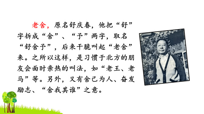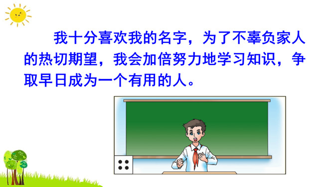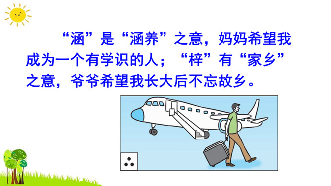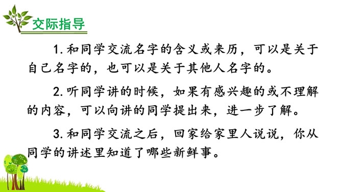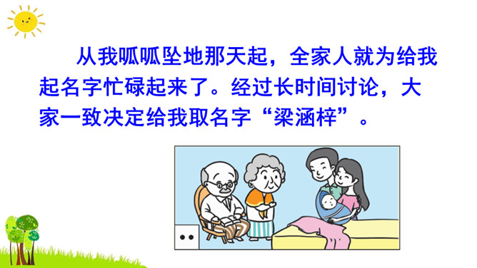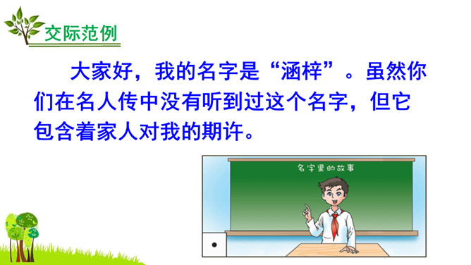 亲爱的同学们,你们还知道哪些名人名字的来由吗?对于自己的名字,你能说出名字里的故事吗?1.和同学交流名字的含义或来历,可以是关于自己名字的,也可以是关于其他人名字的。2.听同学讲的时候,如果有感兴趣的或不理解的内容,可以向讲的同学提出来,进一步了解。3.和同学交流之后,回家给家里人说说,你从同学的讲述里知道了哪些新鲜事。大家好,我的名字是“涵梓”。虽然你们在名人传中没有听到过这个名字,但它包含着家人对我的期许。所属专题:名字里的故事ppt。