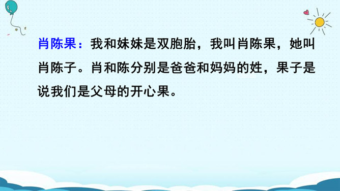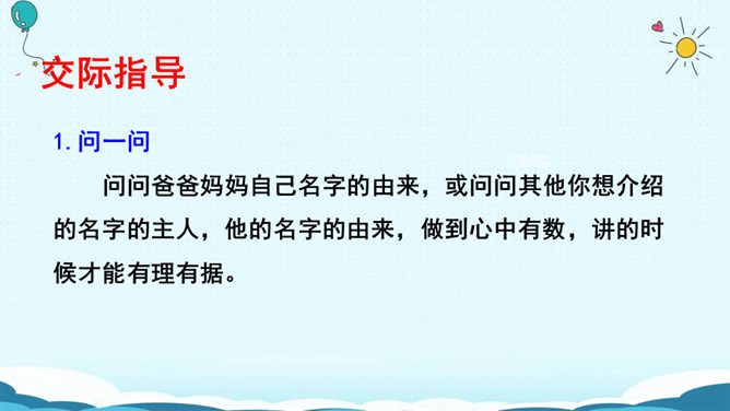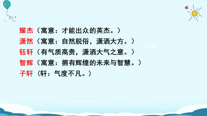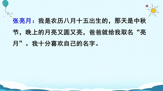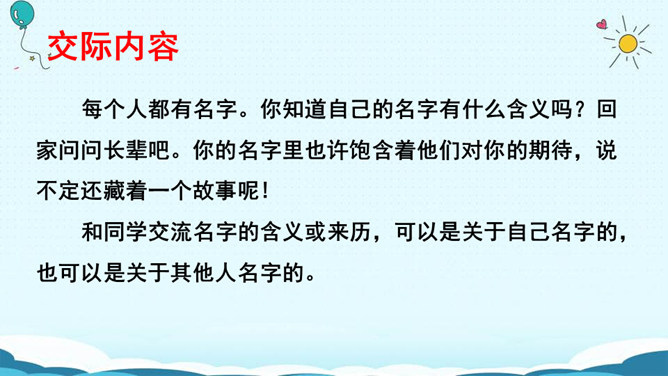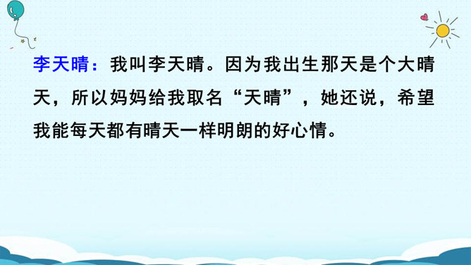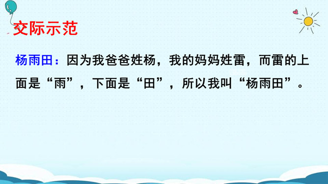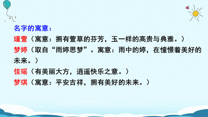 名字的寓意:瑾萱(寓意:拥有萱草的芬芳,玉一样的高贵与典雅。) 梦婷(取自“雨婷思梦”。寓意:雨中的婷,在憧憬着美好的未来。) 佳瑶(有美丽大方,逍遥快乐之意。)梦琪(寓意:平安吉祥,拥有美好的未来。)主动参与活动,积极与人交流,并做到自然大方,有礼貌。认真倾听别人的讲话,养成耐心听完别人讲话内容的好习惯。评出本次交流中的最佳选手。杨雨田:因为我爸爸姓杨,我的妈妈姓雷,而雷的上面是“雨”,下面是“田”,所以我叫“杨雨田”。所属专题:名字里的故事ppt。