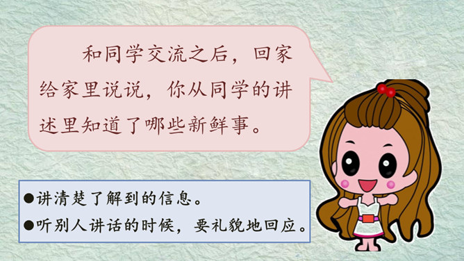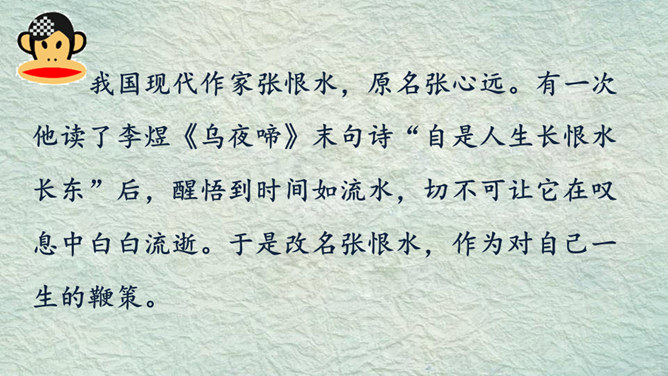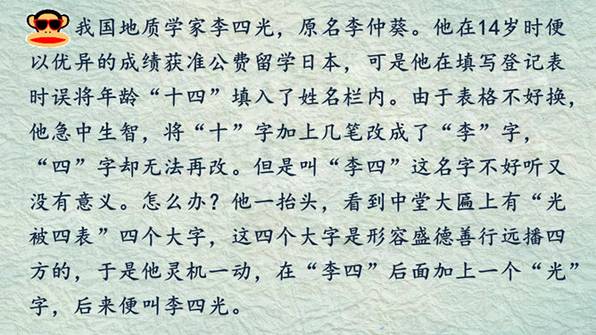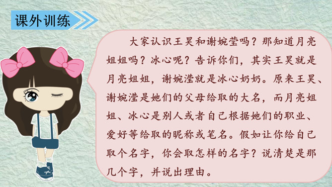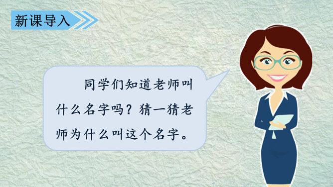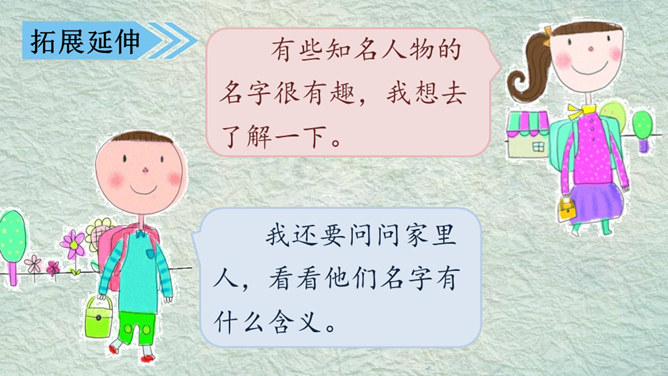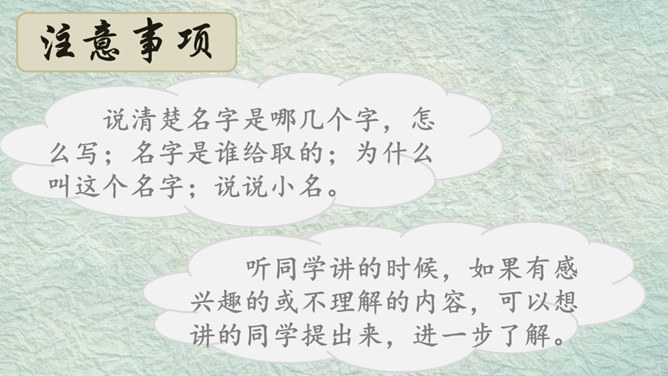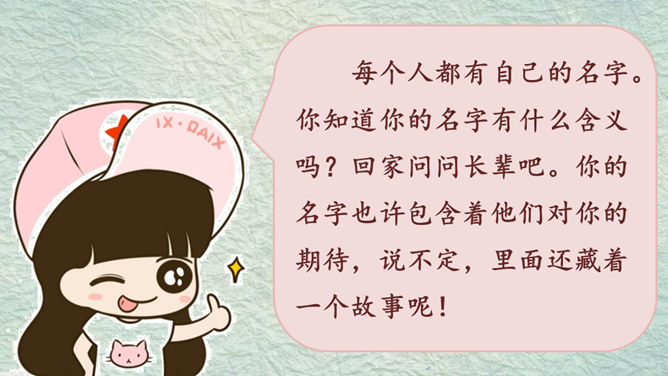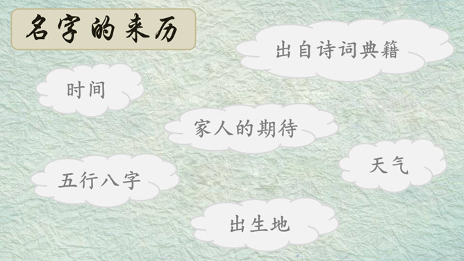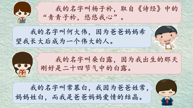 我的名字叫杨子衿,取自《诗经》中的“青青子衿,悠悠我心”。我的名字叫何大伟,因为爸爸妈妈希望我长大后成为一个伟大的人。我的名字叫桑白露,因为我出生的那天刚好是二十四节气中的白露。我的名字叫常慕白,我因为爸爸姓常,妈妈姓白,而我是爸爸妈妈爱情的结晶。根据老师刚刚给出的提示,大家分小组说一说吧!组内评选出说得最好的同学,在全班汇报。所属专题:名字里的故事ppt。