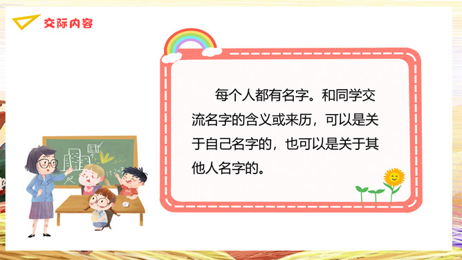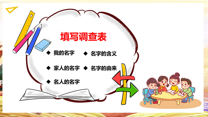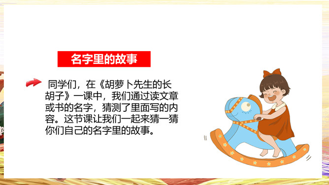 我叫王芃。“芃”字拆开是“草”和“凡”,所以这个名字,有两层意思。第一层,让我像草木一样,接受阳光照耀,接受雨露滋润,茁壮成长,健康成长,快乐成长。第二层意思是希望我像小草一样平凡,在平凡的岗位上作出不平凡的贡献。不求名,不求利,做个普通人。伟大出于平凡,先做平凡人,才可能成大器。我叫张鹏,父母希望我能够“鲲鹏展翅”。你的父母对你寄予了很大的期望。所属专题:名字里的故事ppt。
