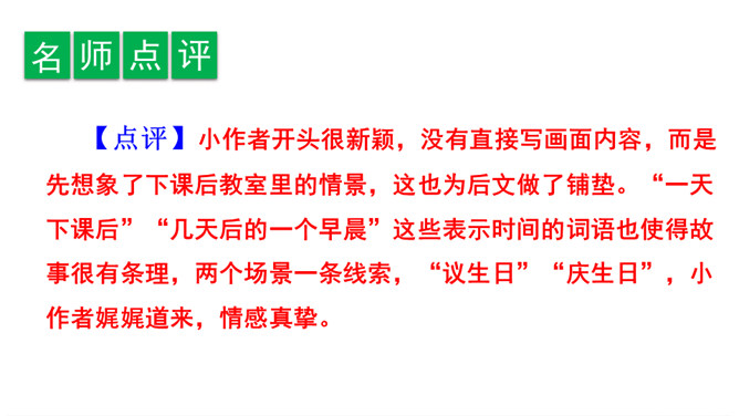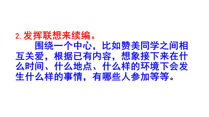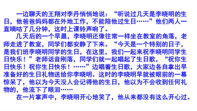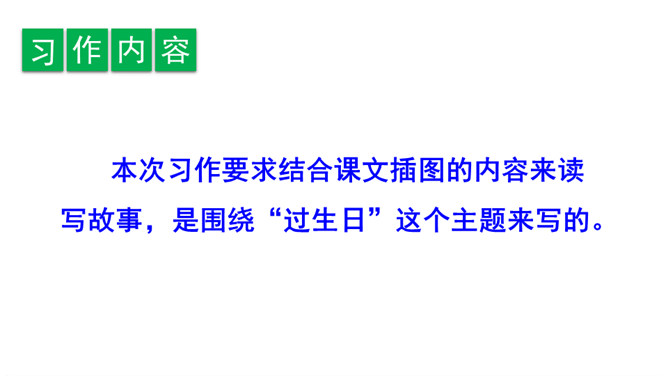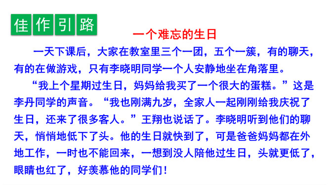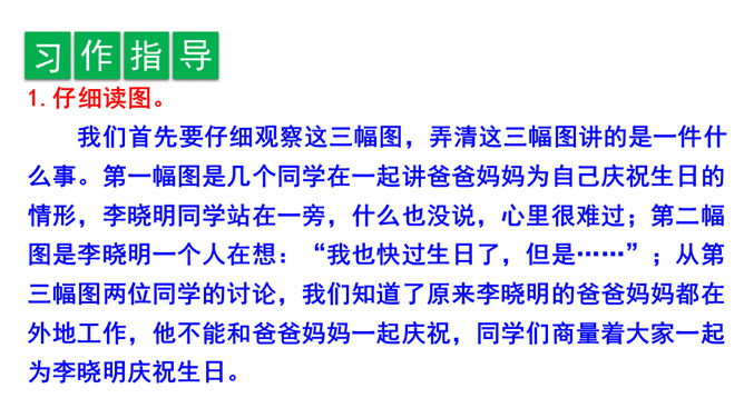 我们首先要仔细观察这三幅图,弄清这三幅图讲的是一件什么事。第一幅图是几个同学在一起讲爸爸妈妈为自己庆祝生日的情形,李晓明同学站在一旁,什么也没说,心里很难过;第二幅图是李晓明一个人在想:“我也快过生日了,但是……”;从第三幅图两位同学的讨论,我们知道了原来李晓明的爸爸妈妈都在外地工作,他不能和爸爸妈妈一起庆祝,同学们商量着大家一起为李晓明庆祝生日。所属专题:续写故事ppt。