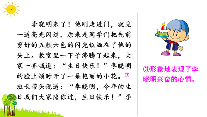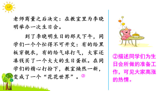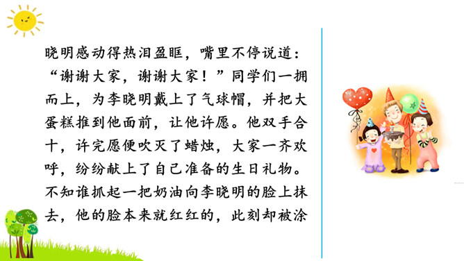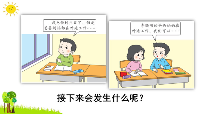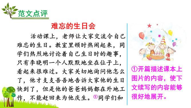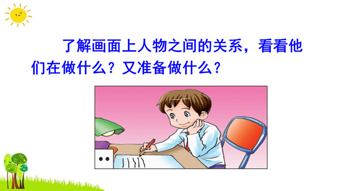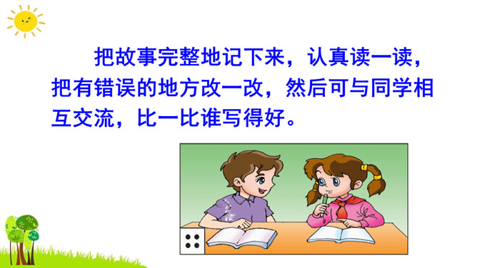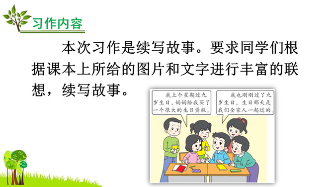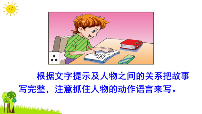 本次习作是续写故事。要求同学们根据课本上所给的图片和文字进行丰富的联想,续写故事。了解画面上人物之间的关系,看看他们在做什么?又准备做什么?根据文字提示及人物之间的关系把故事写完整,注意抓住人物的动作语言来写。把故事完整地记下来,认真读一读,把有错误的地方改一改,然后可与同学相互交流,比一比谁写得好。开篇描述课本上图片的内容,使下文续写的内容能够很好地展开。所属专题:续写故事ppt。