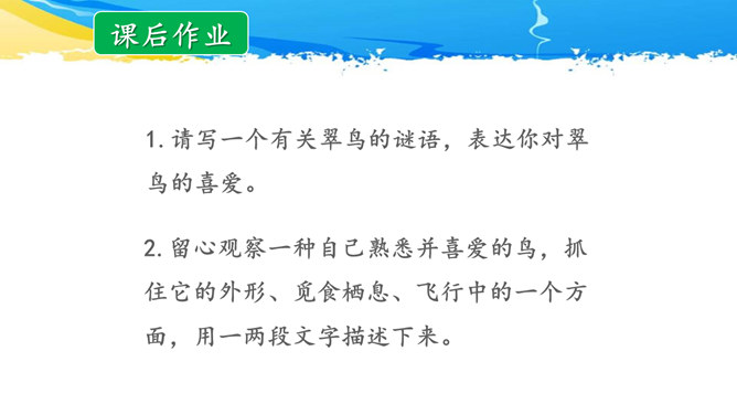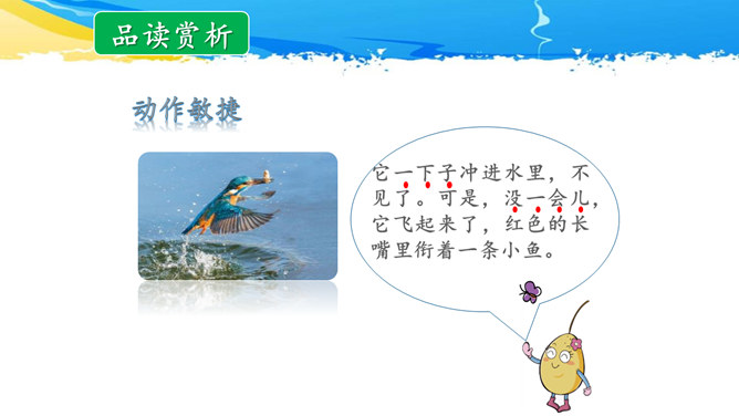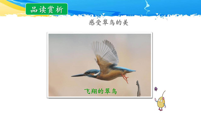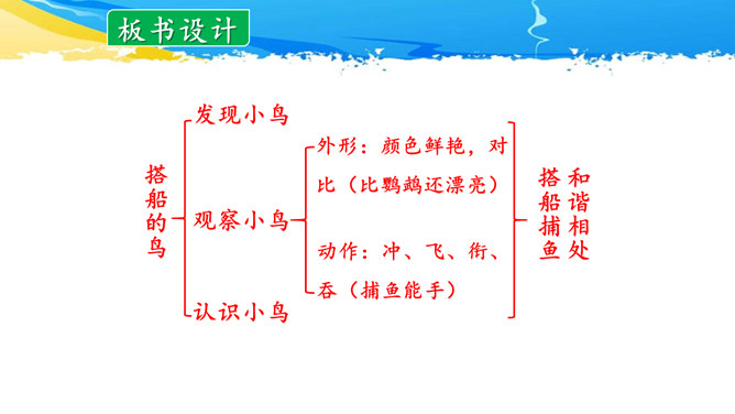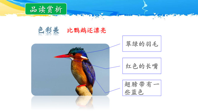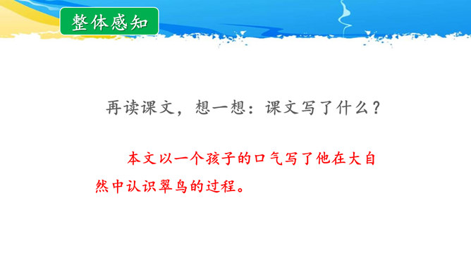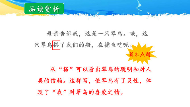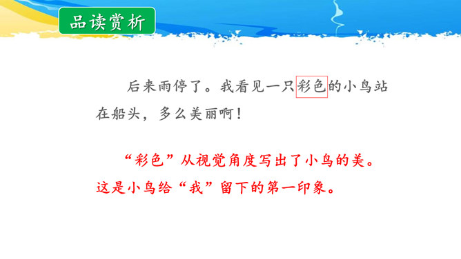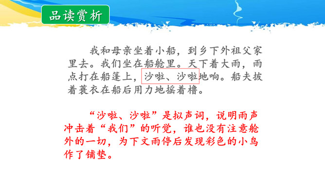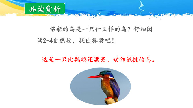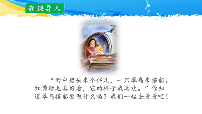 “雨中船头来个伴儿,一只翠鸟来搭船。红嘴绿毛真好看,它的样子我喜欢。”你知道翠鸟搭船要做什么吗?我们一起去看看吧!请同学们自由朗读课文,注意读准字音,读通句子,难读的地方多读几遍。再读课文,想一想:课文写了什么?本文以一个孩子的口气写了他在大自然中认识翠鸟的过程。“沙啦、沙啦”是拟声词,说明雨声冲击着“我们”的听觉,谁也没有注意舱外的一切,为下文雨停后发现彩色的小鸟作了铺垫。所属专题:搭船的鸟ppt。