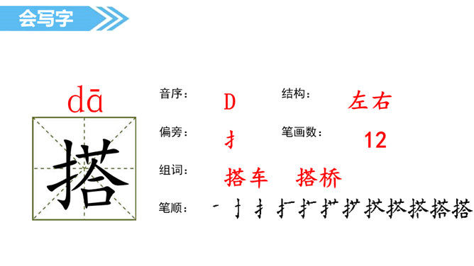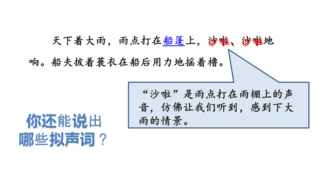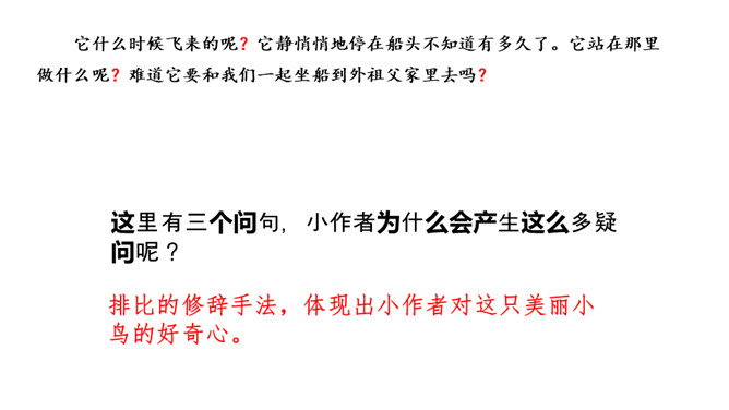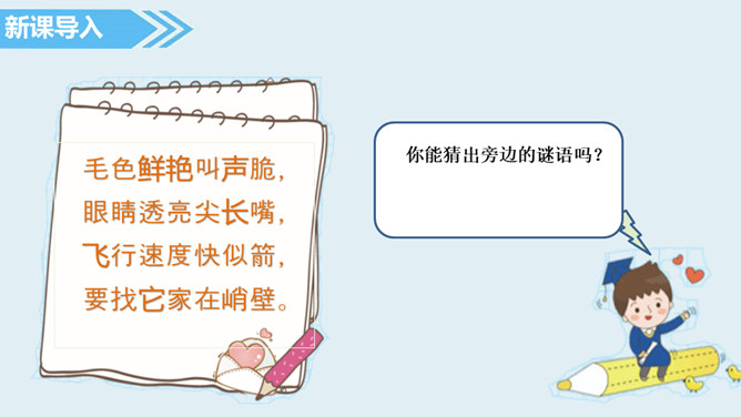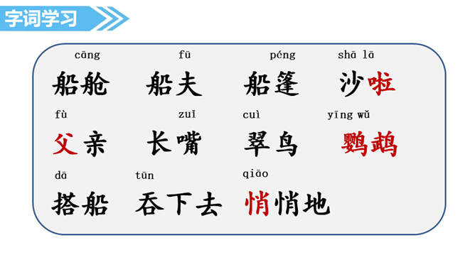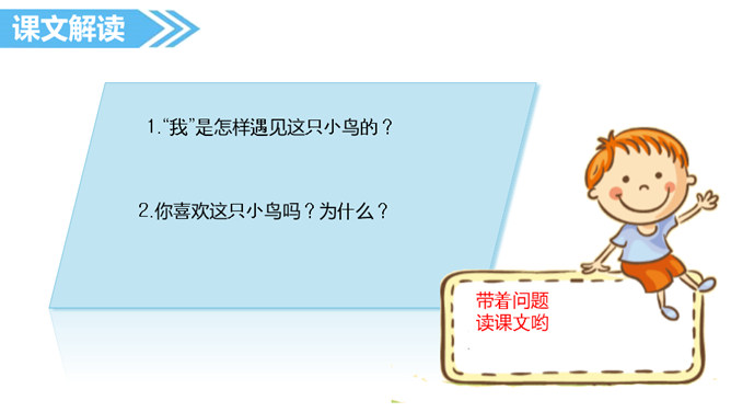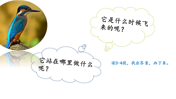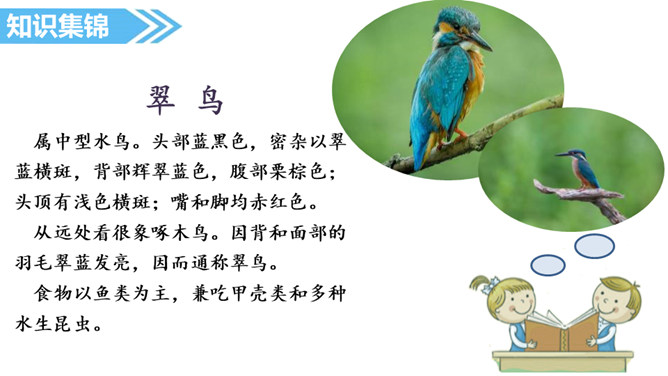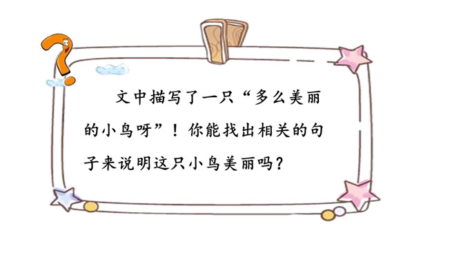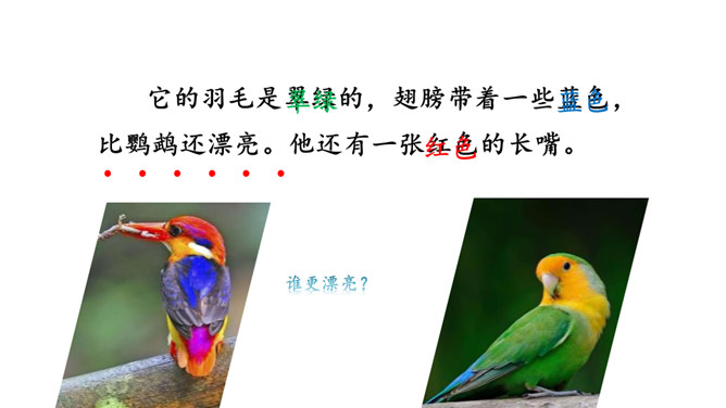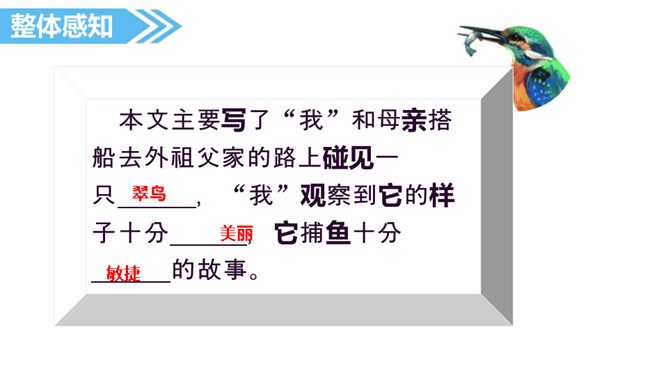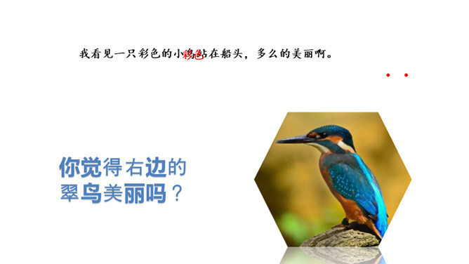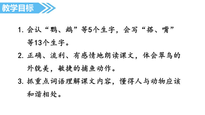 会认“鹦、鹉”等5个生字,会写“搭、嘴”等13个生字。正确、流利、有感情地朗读课文,体会翠鸟的外貌美,敏捷的捕鱼动作。抓重点词语理解课文内容,懂得人与动物应该和谐相处。自由读,要求读准字音,读通句子。和同桌合作读,注意读出感情。边读边勾画,标注你喜欢的词、句和不懂的地方。“我”是怎样遇见这只小鸟的?你喜欢这只小鸟吗?为什么?文中描写了一只“多么美丽的小鸟呀”!你能找出相关的句子来说明这只小鸟美丽吗?所属专题:搭船的鸟ppt。