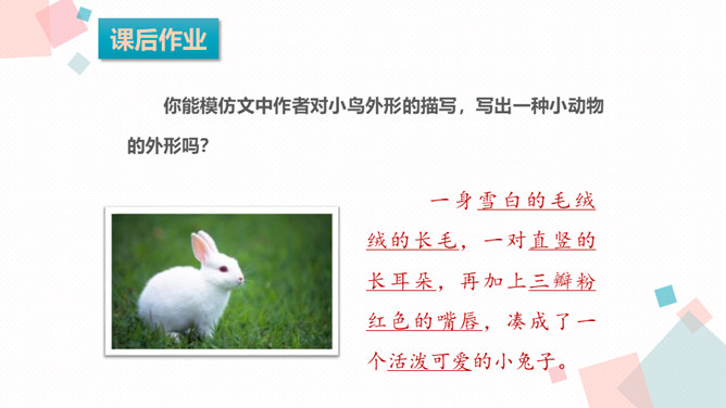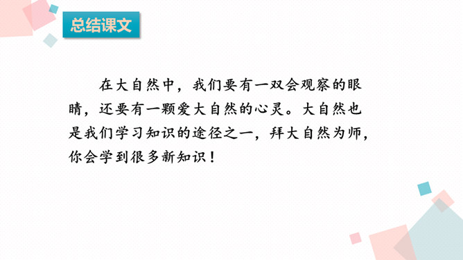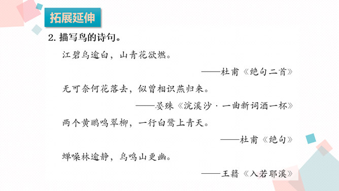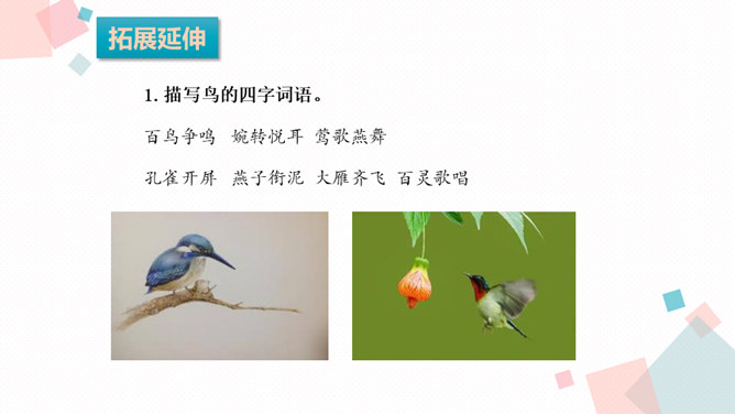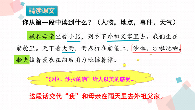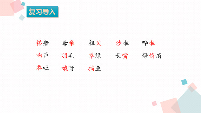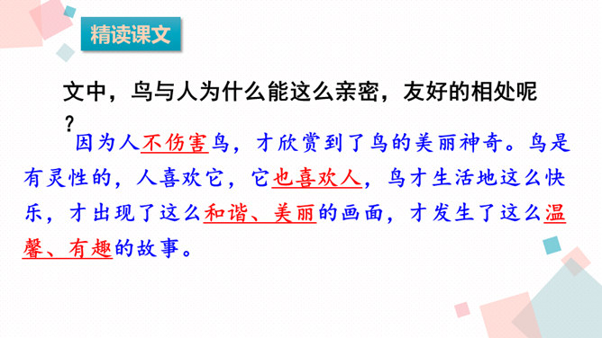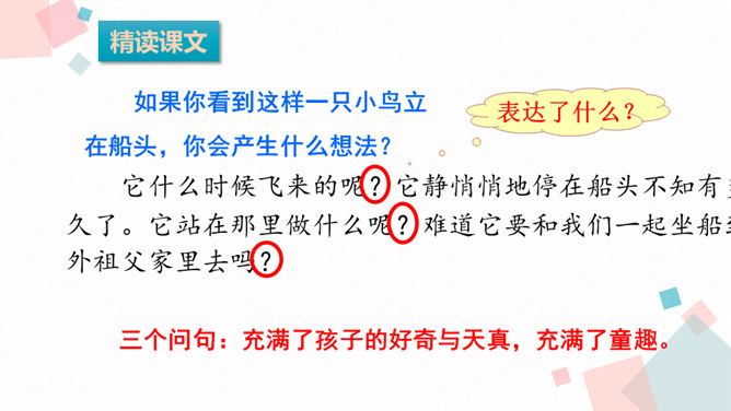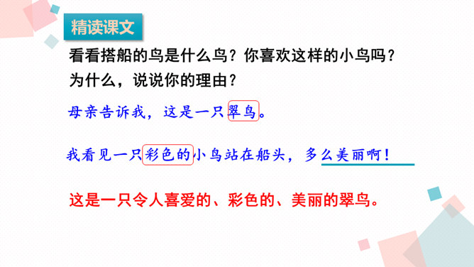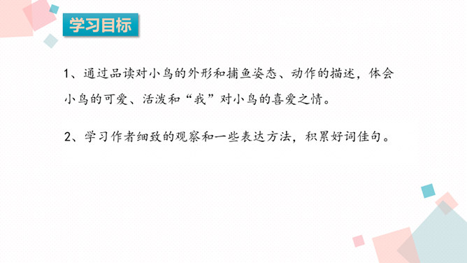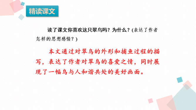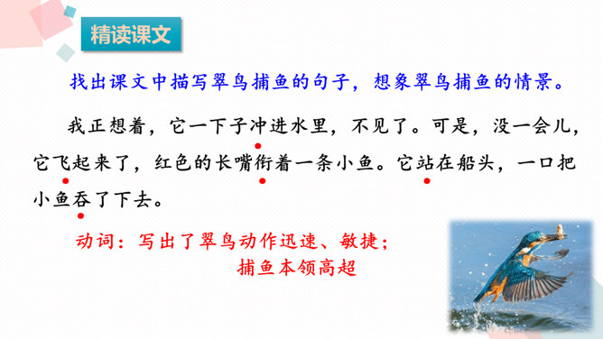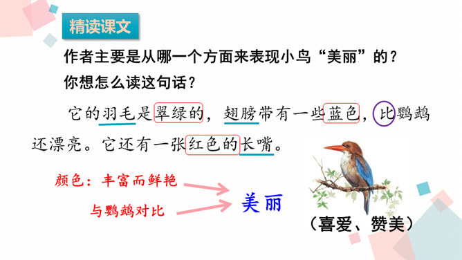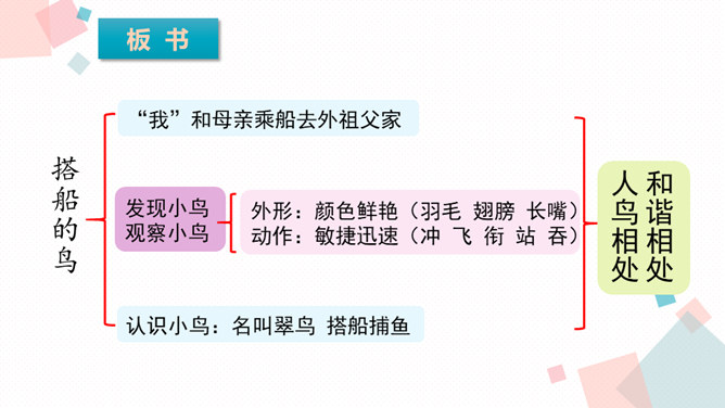 通过品读对小鸟的外形和捕鱼姿态、动作的描述,体会小鸟的可爱、活泼和“我”对小鸟的喜爱之情。学习作者细致的观察和一些表达方法,积累好词佳句。看看搭船的鸟是什么鸟?你喜欢这样的小鸟吗?为什么,说说你的理由?这段话交代“我”和母亲在雨天里去外祖父家。三个问句:充满了孩子的好奇与天真,充满了童趣。本文通过对翠鸟的外形和捕鱼过程的描写,表达了作者对翠鸟的喜爱之情,同时展现了一幅鸟与人和谐共处的美好画面。所属专题:搭船的鸟ppt。