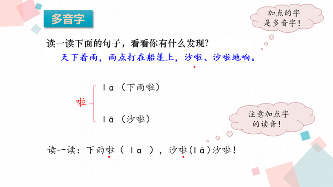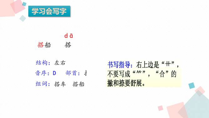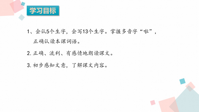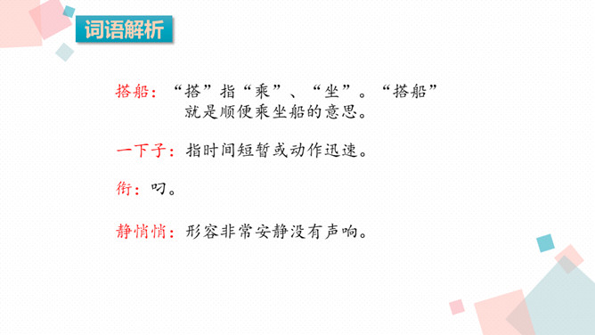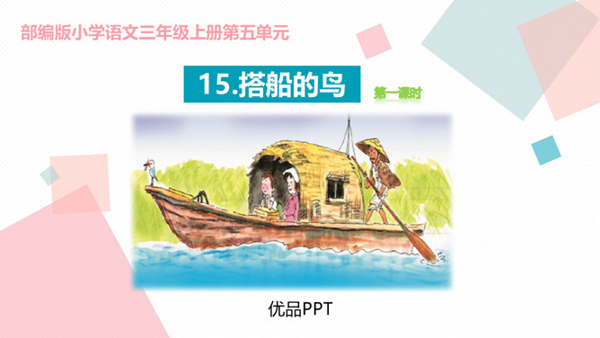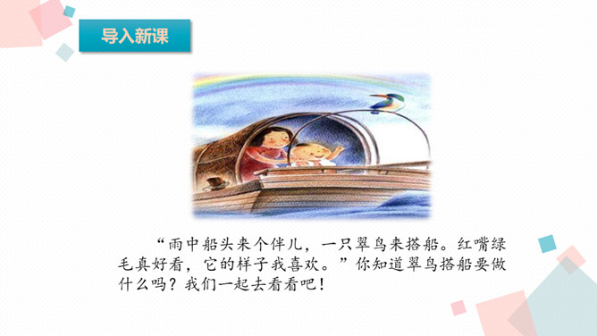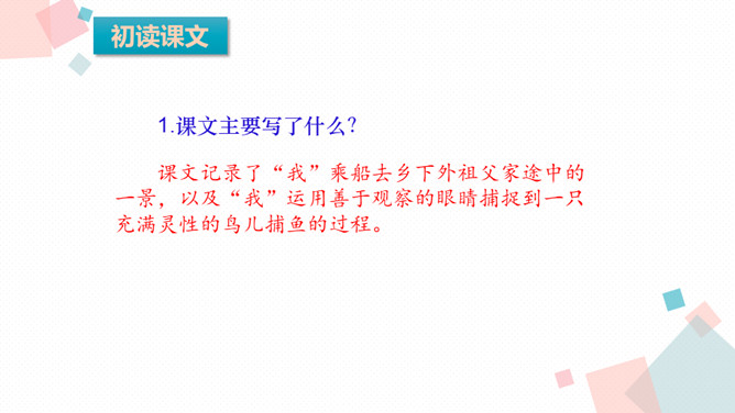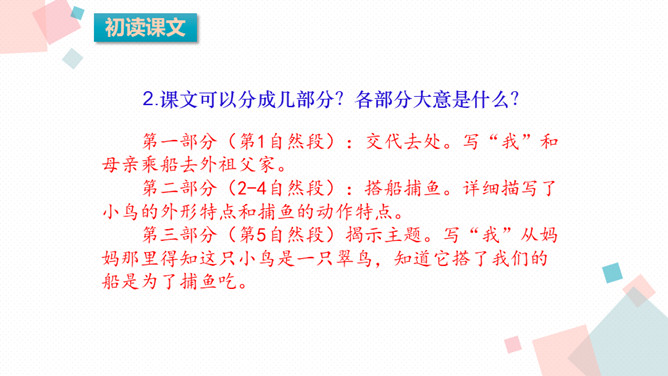 课文可以分成几部分?各部分大意是什么?第一部分(第1自然段):交代去处。写“我”和母亲乘船去外祖父家。第二部分(2-4自然段):搭船捕鱼。详细描写了小鸟的外形特点和捕鱼的动作特点。第三部分(第5自然段)揭示主题。写“我”从妈妈那里得知这只小鸟是一只翠鸟,知道它搭了我们的船是为了捕鱼吃。课文主要写了什么?课文记录了“我”乘船去乡下外祖父家途中的一景,以及“我”运用善于观察的眼睛捕捉到一只充满灵性的鸟儿捕鱼的过程。所属专题:搭船的鸟ppt。