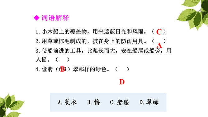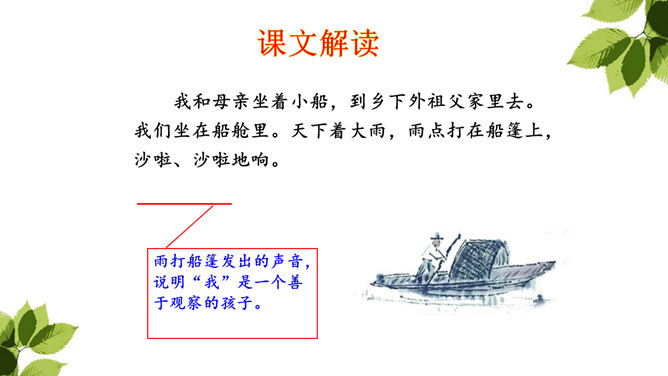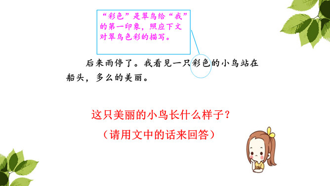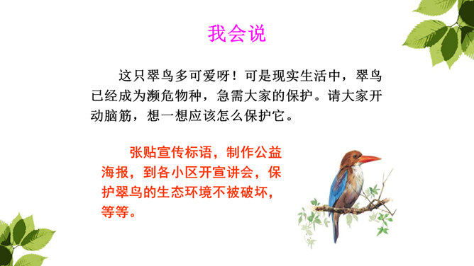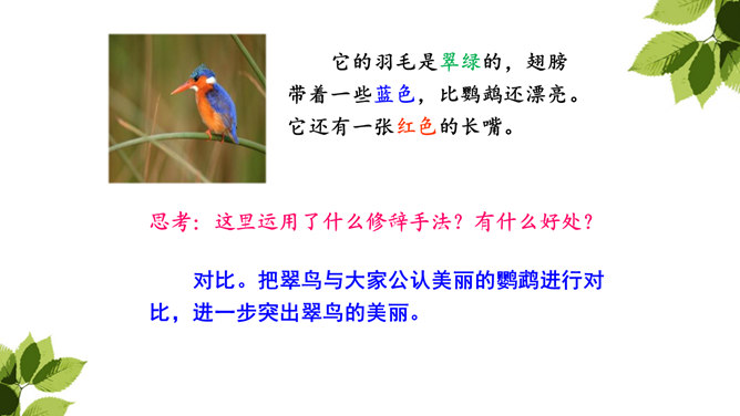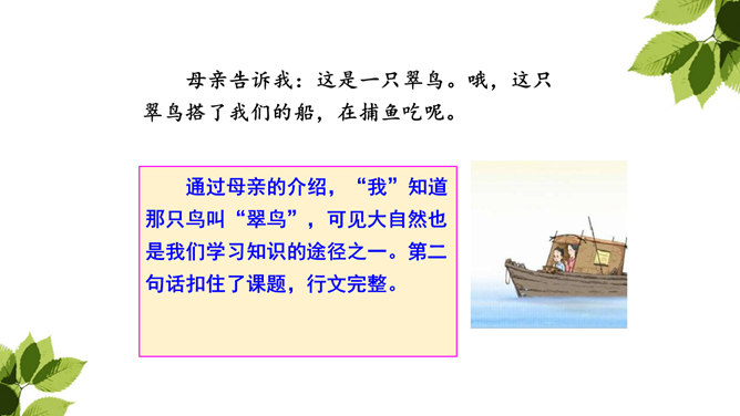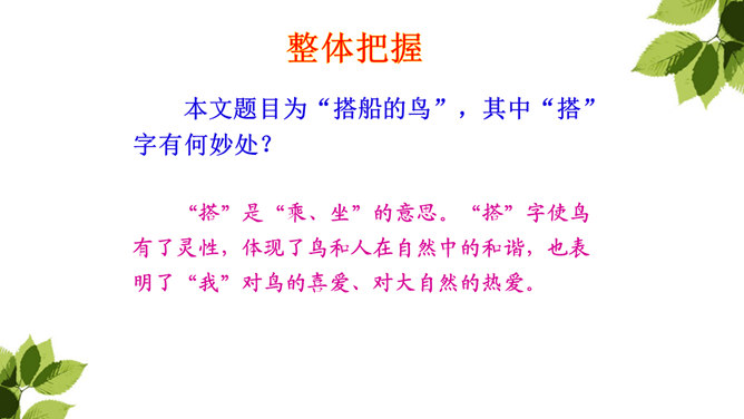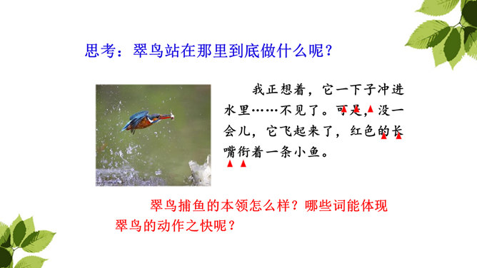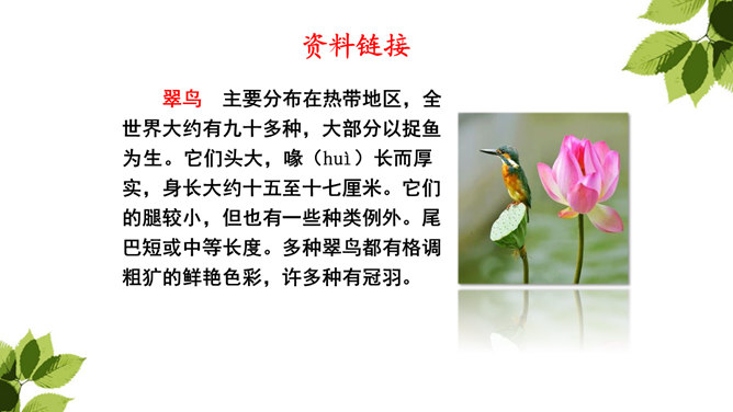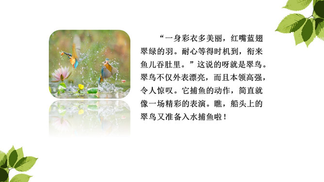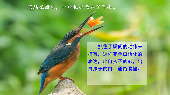 翠鸟不仅外表漂亮,而且本领高强,令人惊叹。它捕鱼的动作,简直就像一场精彩的表演。瞧,船头上的翠鸟又准备入水捕鱼啦!“一身彩衣多美丽,红嘴蓝翅翠绿的羽。耐心等得时机到,衔来鱼儿吞肚里。”这说的呀就是翠鸟。本文题目为“搭船的鸟”,其中“搭”字有何妙处?“搭”是“乘、坐”的意思。“搭”字使鸟有了灵性,体现了鸟和人在自然中的和谐,也表明了“我”对鸟的喜爱、对大自然的热爱。所属专题:搭船的鸟ppt。
