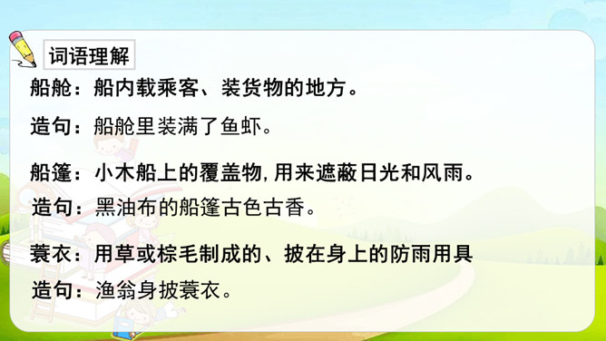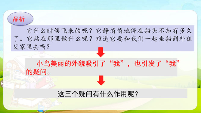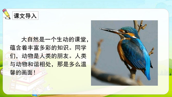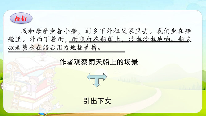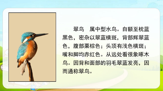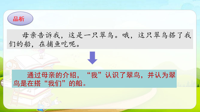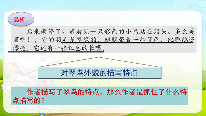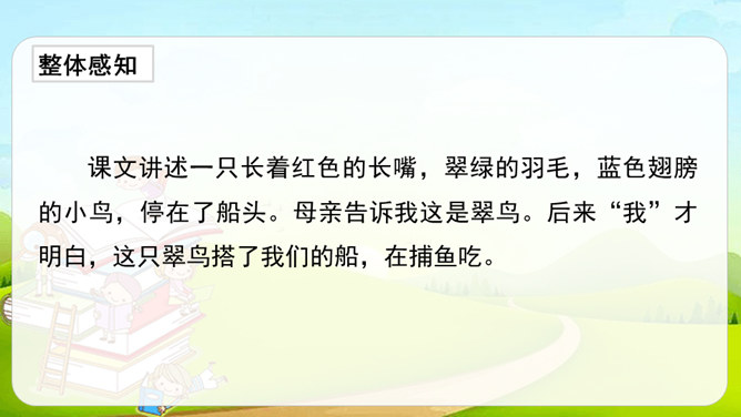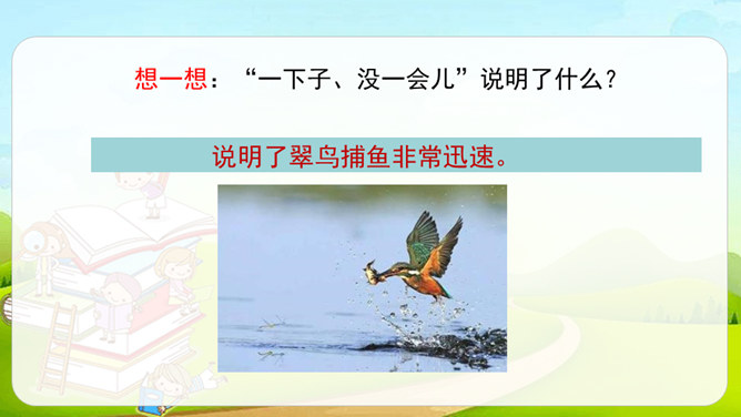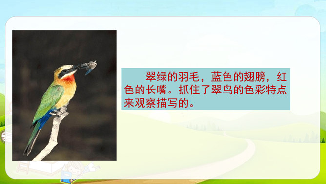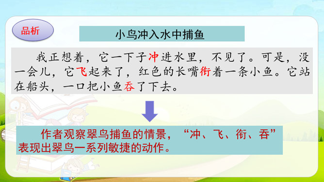 第1自然段,作者观察了雨天船上的场景。第2-4自然段,作者观察了翠鸟的外貌及翠鸟捕鱼时的样子。其中第2、4自然段集中体现了作者观察的细致,可以抓住描写外貌和动作的词语来具体说明。文中的“我”观察很细致。坐在船舱里,“我”听到雨点打在船篷上“沙啦沙啦”响的声音。翠鸟出现后,“我”看到了它美丽的外貌:羽毛是翠绿的,翅膀带着一些蓝色,还有一张红色的长嘴。接着,我”又看到了翠鸟捕鱼时“冲”“飞”“衔”“站”“吞”等一系列敏捷的动作。所属专题:搭船的鸟ppt。