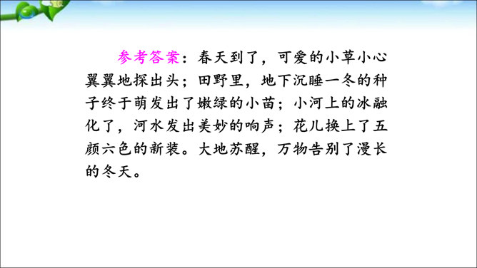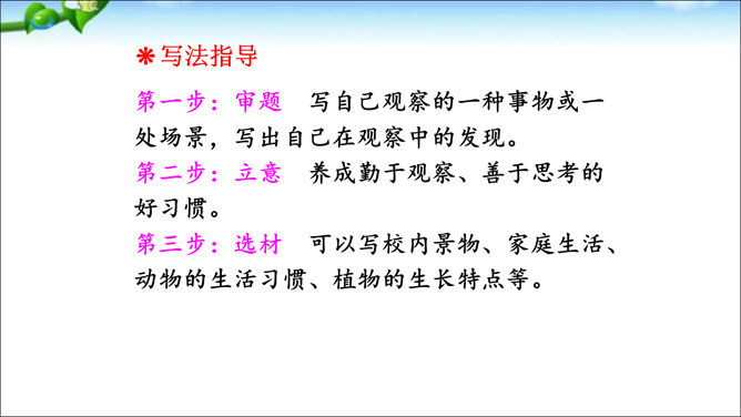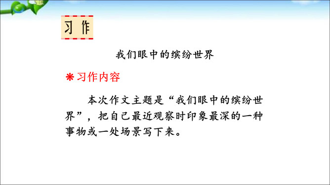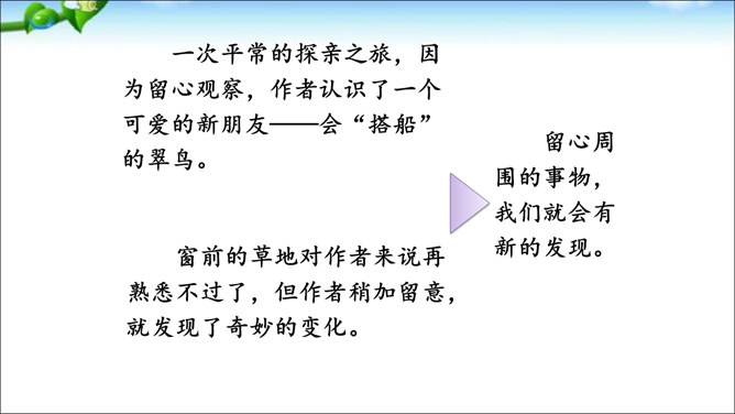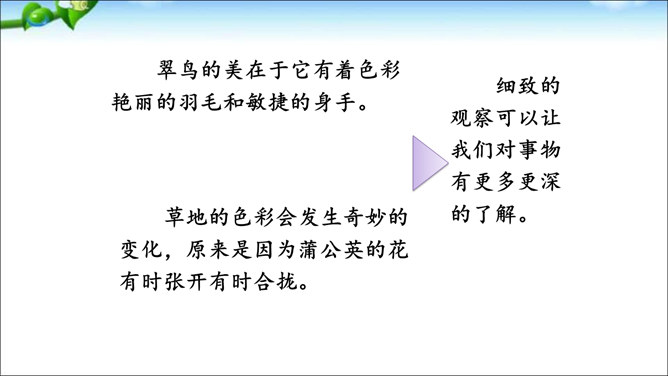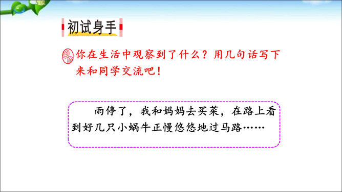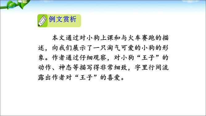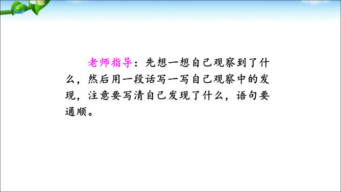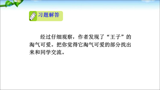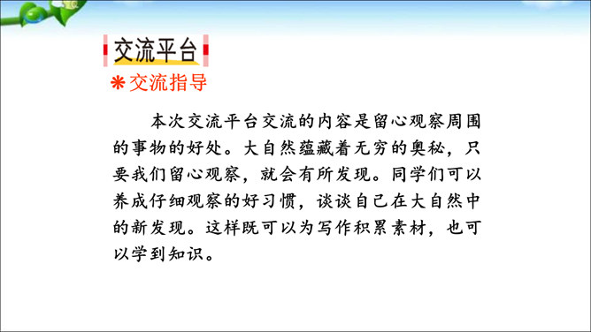 本次交流平台交流的内容是留心观察周围的事物的好处。大自然蕴藏着无穷的奥秘,只要我们留心观察,就会有所发现。同学们可以养成仔细观察的好习惯,谈谈自己在大自然中的新发现。这样既可以为写作积累素材,也可以学到知识。老师指导:先想一想自己观察到了什么,然后用一段话写一写自己观察中的发现,注意要写清自己发现了什么,语句要通顺。经过仔细观察,作者发现了“王子”的淘气可爱。把你觉得它淘气可爱的部分找出来和同学交流。所属专题:我们眼中的缤纷世界ppt。