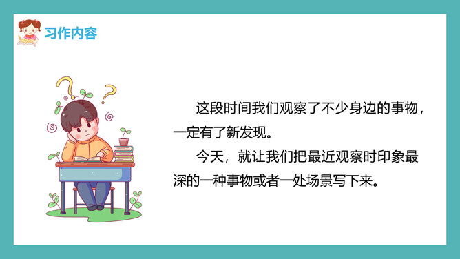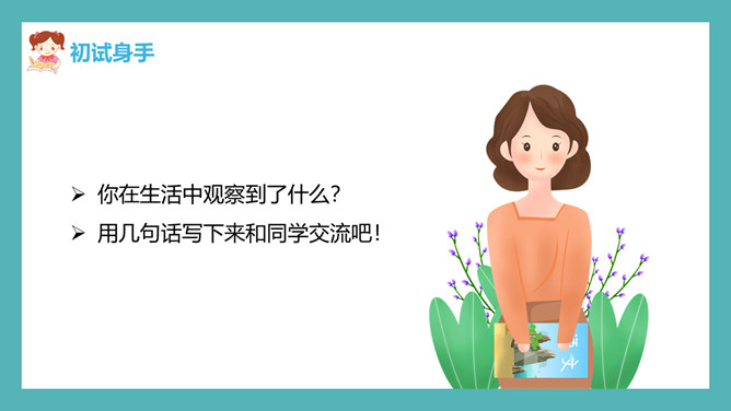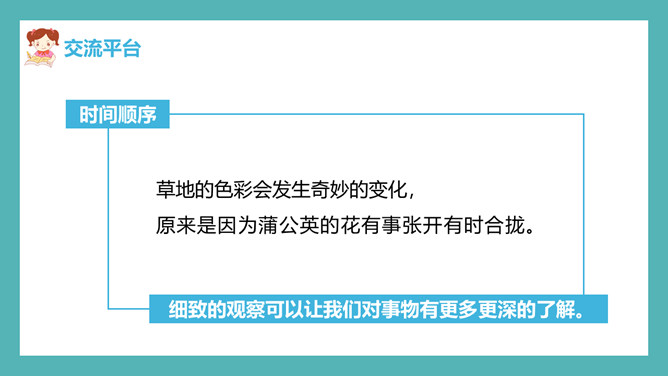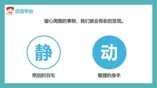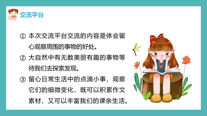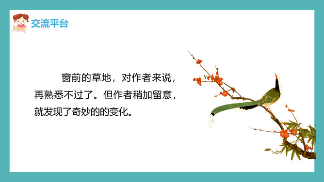 留心日常生活中的点滴小事,观察它们的细微变化,既可以积累作文素材,又可以丰富我们的课余生活。大自然中有无数美丽有趣的事物等待我们去探索发现。本次交流平台交流的内容是体会留心观察周围的事物的好处。一次平常的探亲之旅,因为留心观察,作者认识了一个可爱的新朋友——会“搭船”的翠鸟。 窗前的草地,对作者来说,再熟悉不过了。但作者稍加留意,就发现了奇妙的的变化。所属专题:我们眼中的缤纷世界ppt。