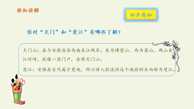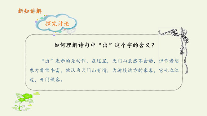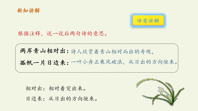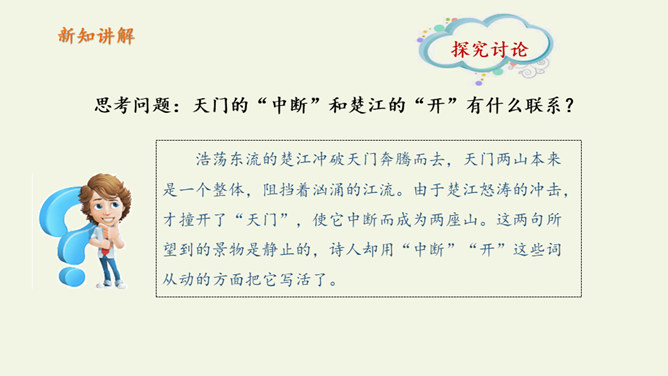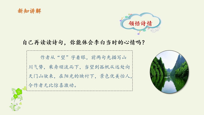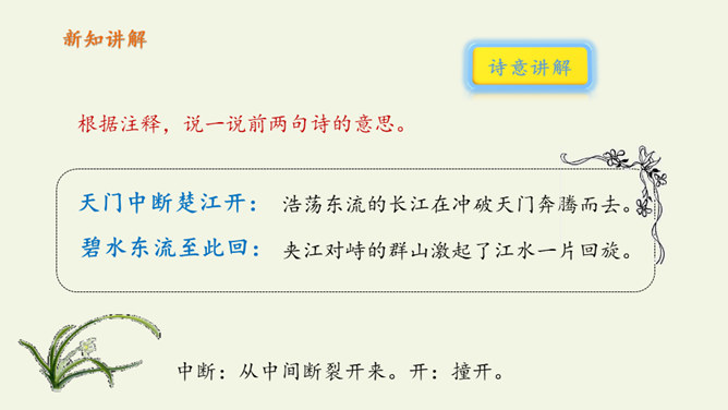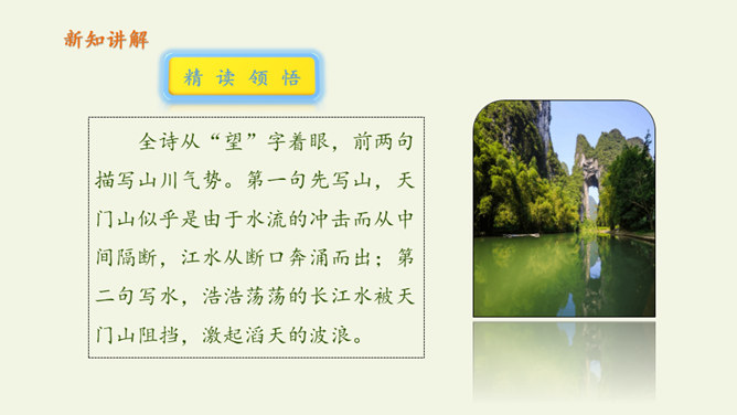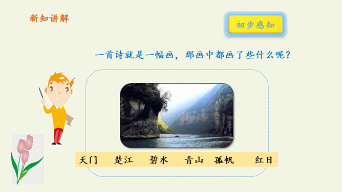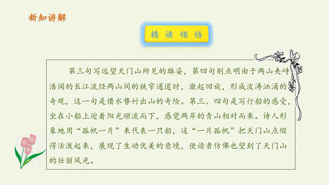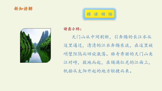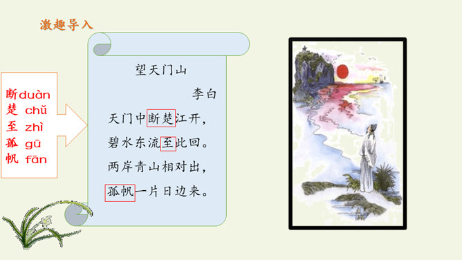 自读课文:1、大声朗读课文,注意读准字音。2、比一比,看谁读得好。第三句写远望天门山所见的雄姿,第四句则点明由于两山夹峙,浩阔的长江流经两山间的狭窄通道时,激起回旋,形成波涛汹涌的奇观,这一句是借水势衬出山的奇险。第三、四句是写行船的感受,坐在小船上迎着阳光顺流而下,感觉两岸的青山相对而来。诗人形象地用“孤帆一片”来代表一只船,这“一片孤帆”把天门山点缀得活泼起来,展现了生动优美的意境,使读者仿佛也望到了天门山的壮丽风光。所属专题:望天门山ppt。