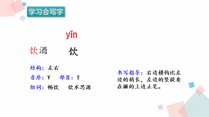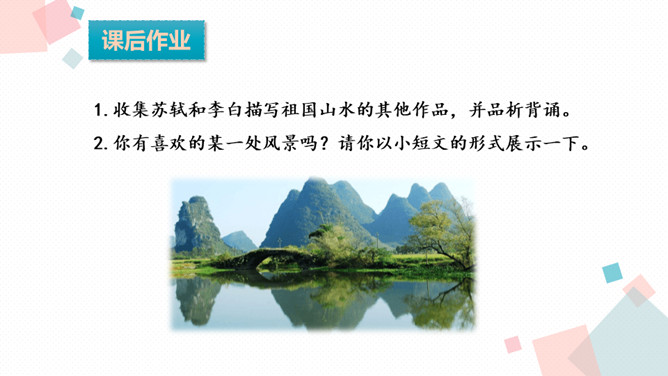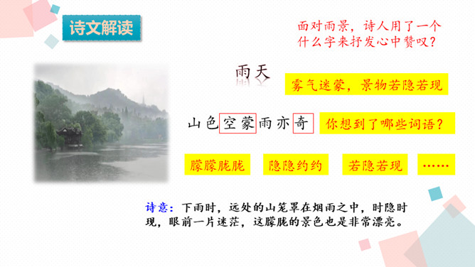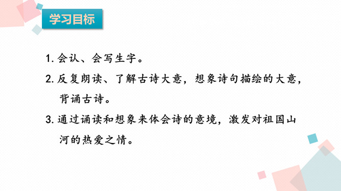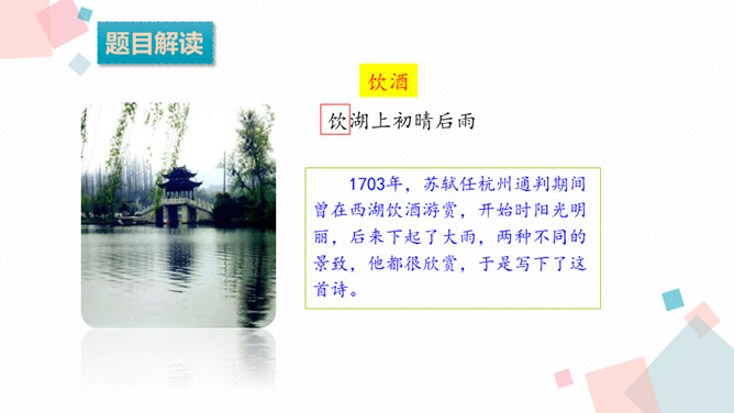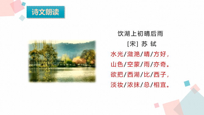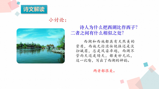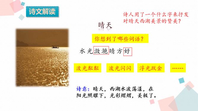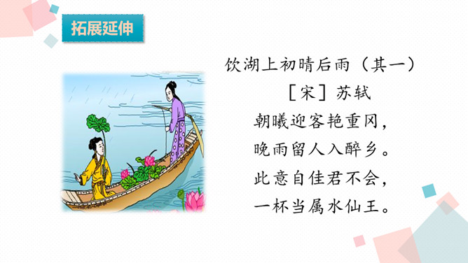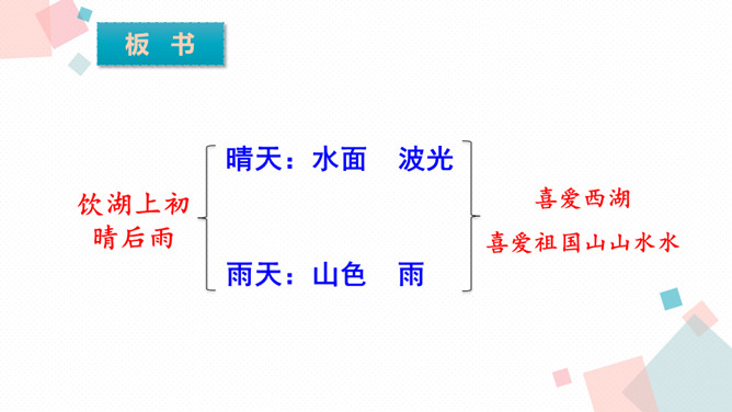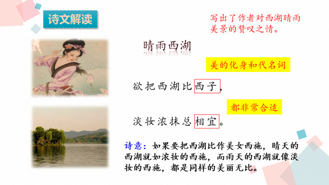 学习目标:1.会认、会写生字。2.反复朗读、了解古诗大意,想象诗句描绘的大意,背诵古诗。3.通过诵读和想象来体会诗的意境,激发对祖国山河的热爱之情。诗人为什么把西湖比作西子?二者之间有什么相似之处?西湖和西施都具有天然美的资质,西施无论浓妆艳抹还是淡扫娥眉,总是风姿卓越,西湖不管雨天还是晴天,都美妙无比,这一比喻,写出了西湖的神韵。表达了诗人对自然山水的喜爱与赞美之情。