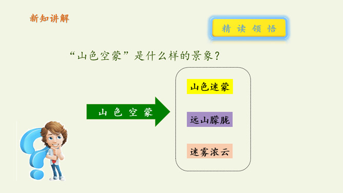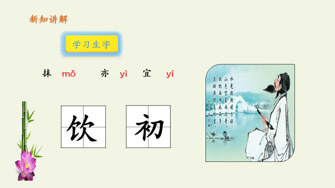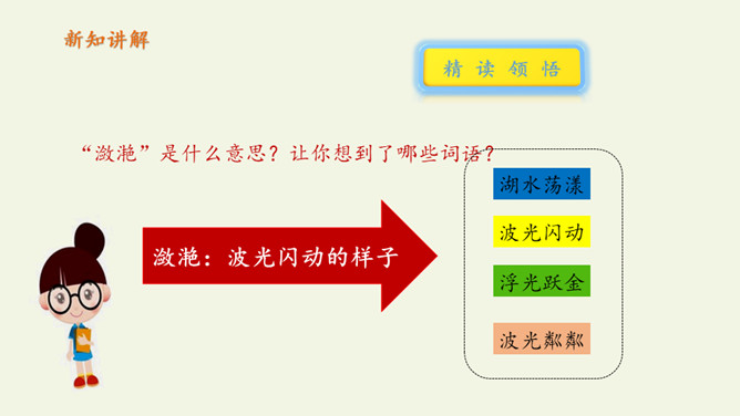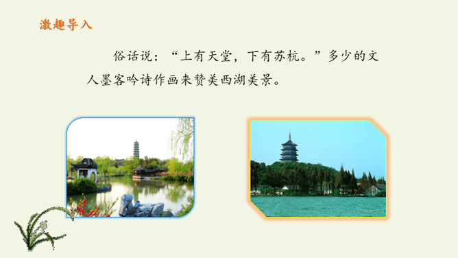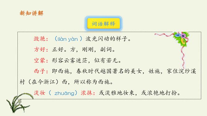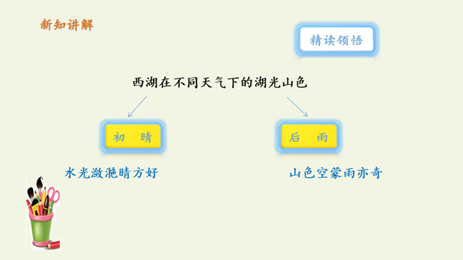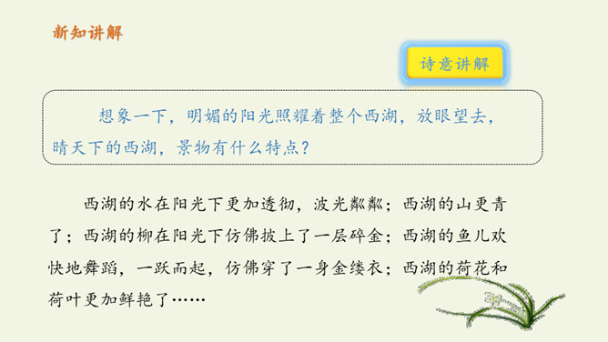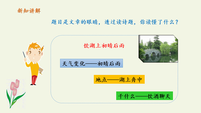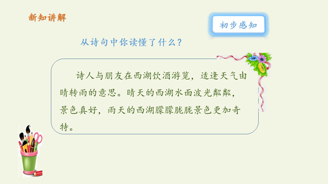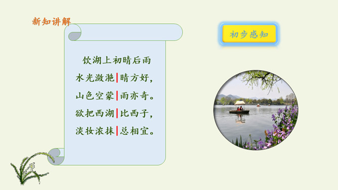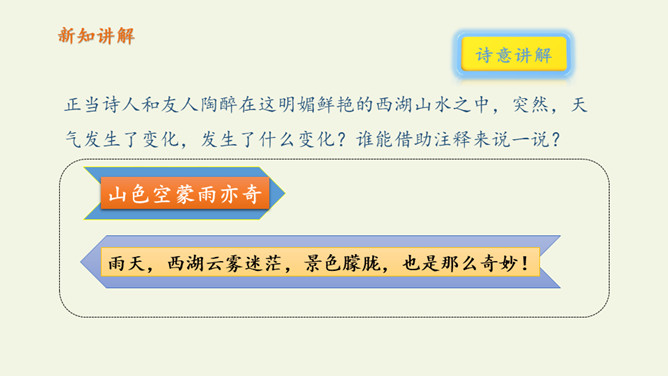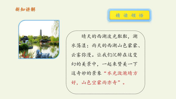 俗话说:“上有天堂,下有苏杭。”多少的文人墨客吟诗作画来赞美西湖美景。1.教师范读,指导停顿(注意节奏停顿)。2.指名试读,读出诗的节奏、韵律。3.学生按节奏自由朗读,要求:放声朗读,读准字音。从诗句中你读懂了什么?诗人与朋友在西湖饮酒游览,适逢天气由晴转雨的意思。晴天的西湖水面波光粼粼,景色真好,雨天的西湖朦朦胧胧景色更加奇特。想象一下,明媚的阳光照耀着整个西湖,放眼望去,晴天下的西湖,景物有什么特点?