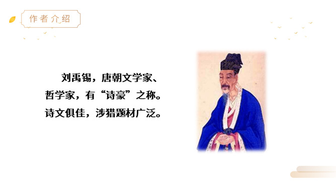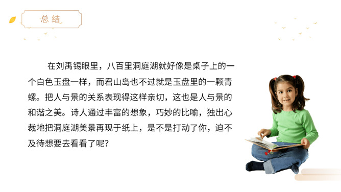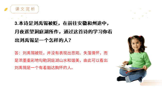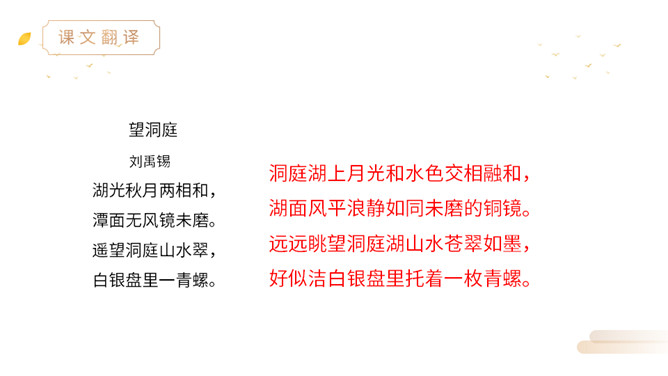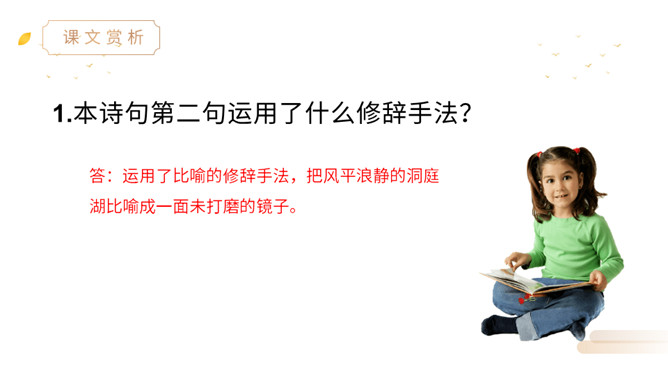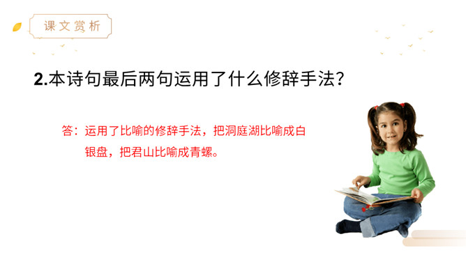 本诗句第二句运用了什么修辞手法?答:运用了比喻的修辞手法,把风平浪静的洞庭湖比喻成一面未打磨的镜子。本诗句最后两句运用了什么修辞手法?答:运用了比喻的修辞手法,把洞庭湖比喻成白银盘,把君山比喻成青螺。本诗是刘禹锡被贬,在前往安徽和州途中,月夜遥望洞庭湖所作,通过这首诗的学习你看出刘禹锡是一个怎样的人?答:刘禹锡被贬,并没有表现出悲观、失落情怀,而是浓墨重彩地勾勒洞庭湖山水和谐美,由此可以看出刘禹锡是一个有着豁达胸怀的人。所属专题:望洞庭ppt。
