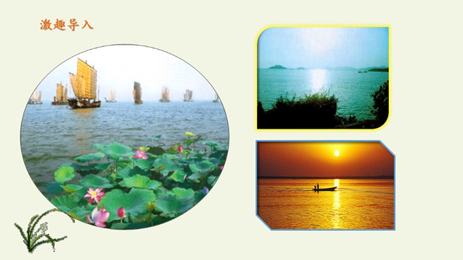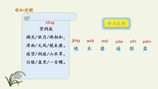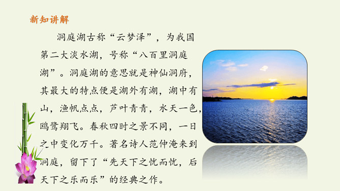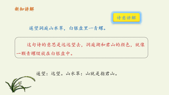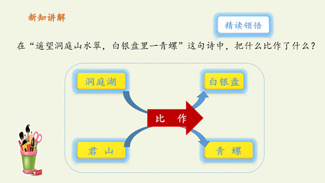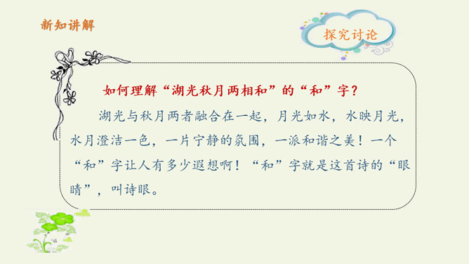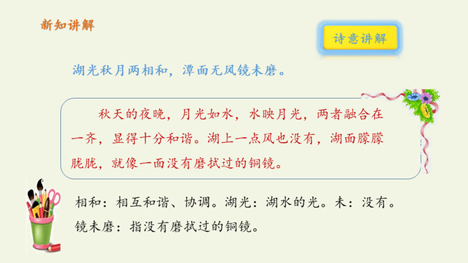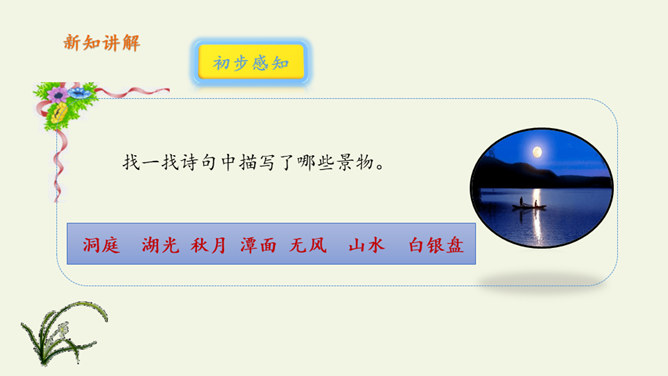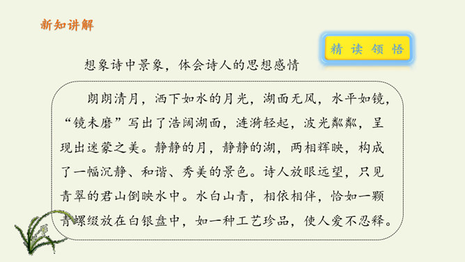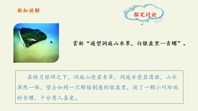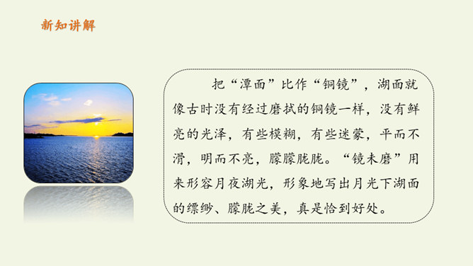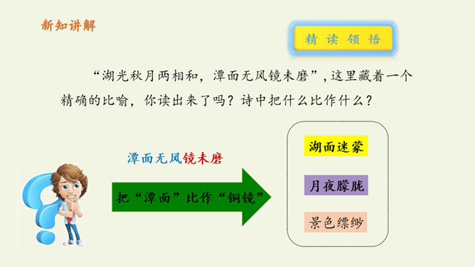 如何理解“湖光秋月两相和”的“和”字?湖光与秋月两者融合在一起,月光如水,水映月光,水月澄洁一色,一片宁静的氛围,一派和谐之美!一个“和”字让人有多少遐想啊!“和”字就是这首诗的“眼睛”,叫诗眼。“湖光秋月两相和,潭面无风镜未磨”,这里藏着一个精确的比喻,你读出来了吗?诗中把什么比作什么?把“潭面”比作“铜镜”,湖面就像古时没有经过磨拭的铜镜一样,没有鲜亮的光泽,有些模糊,有些迷蒙,平而不滑,明而不亮,朦朦胧胧。“镜未磨”用来形容月夜湖光,形象地写出月光下湖面的缥缈、朦胧之美,真是恰到好处。所属专题:望洞庭ppt。