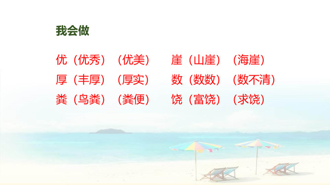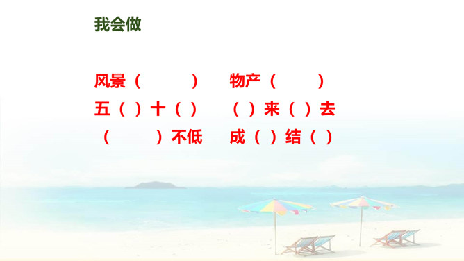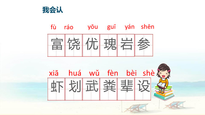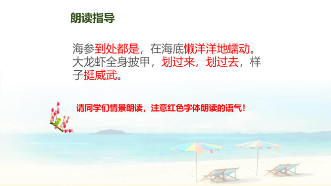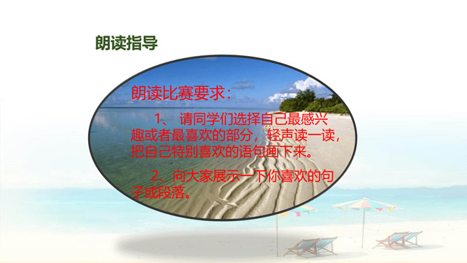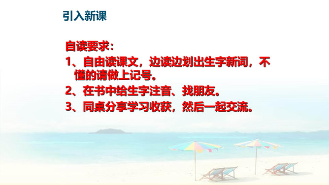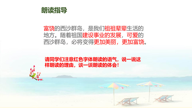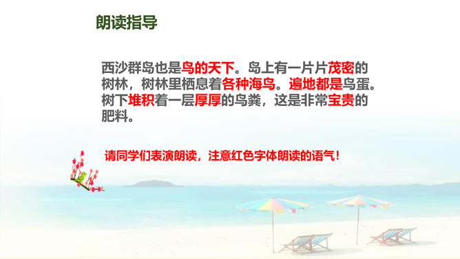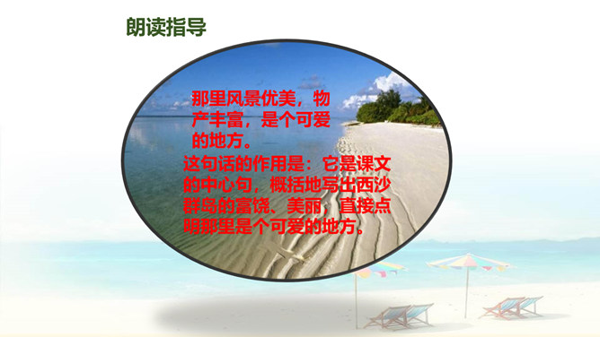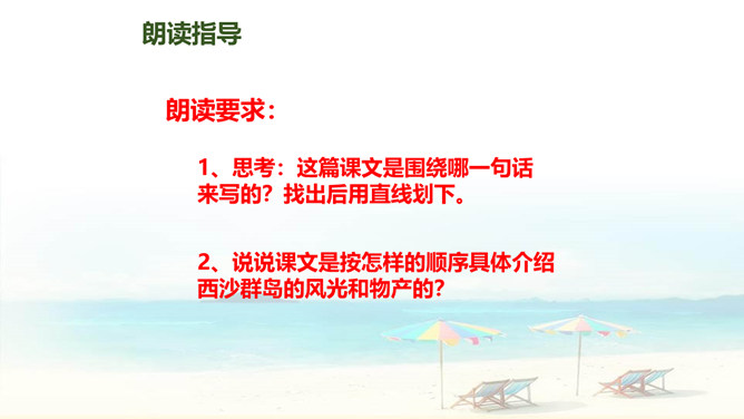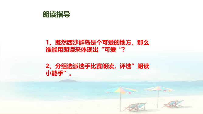 自读要求:1、自由读课文,边读边划出生字新词,不懂的请做上记号。2、在书中给生字注音、找朋友。3、同桌分享学习收获,然后一起交流。朗读要求:1、思考:这篇课文是围绕哪一句话来写的?找出后用直线划下。 2、说说课文是按怎样的顺序具体介绍西沙群岛的风光和物产的?这句话的作用是:它是课文的中心句,概括地写出西沙群岛的富饶、美丽,直接点明那里是个可爱的地方。 分组选派选手比赛朗读,评选”朗读小能手”。