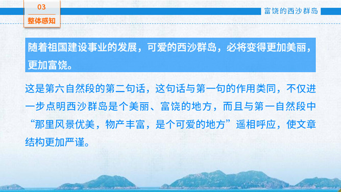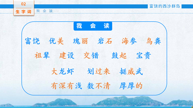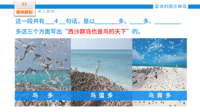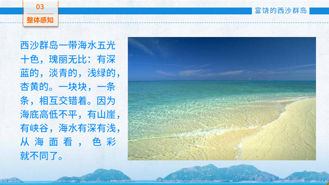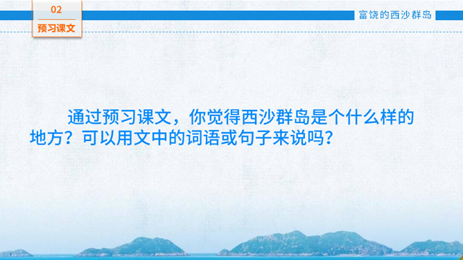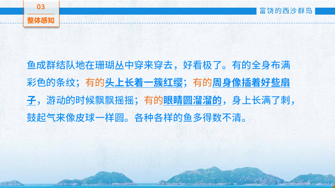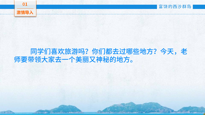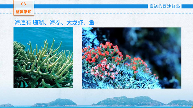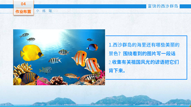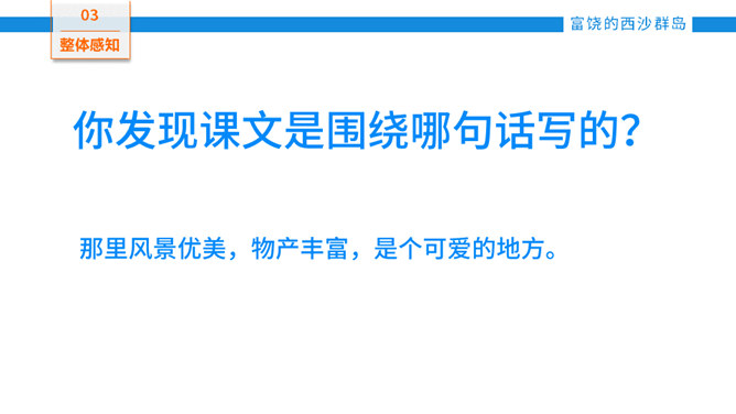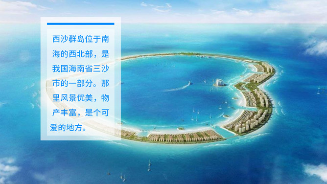 同学们喜欢旅游吗?你们都去过哪些地方?今天,老师要带领大家去一个美丽又神秘的地方。西沙群岛位于南海的西北部,是我国海南省三沙市的一部分。那里风景优美,物产丰富,是个可爱的地方。通过预习课文,你觉得西沙群岛是个什么样的地方?可以用文中的词语或句子来说吗?快速读课文,说一说课文介绍了西沙群岛的哪些地方?你发现课文是围绕哪句话写的?1.西沙群岛的海里还有哪些美丽的景色?围绕看到的图片写一段话。