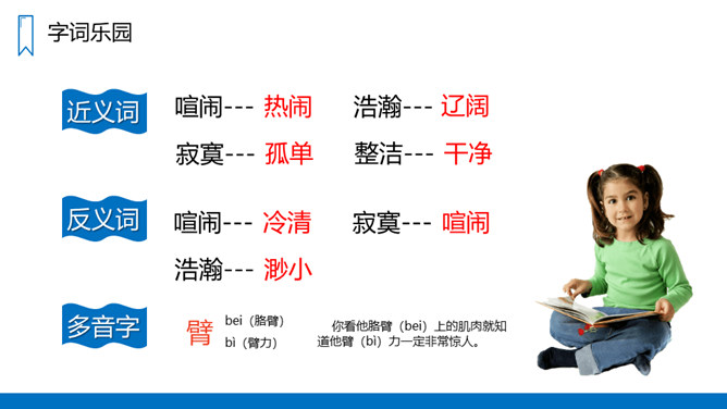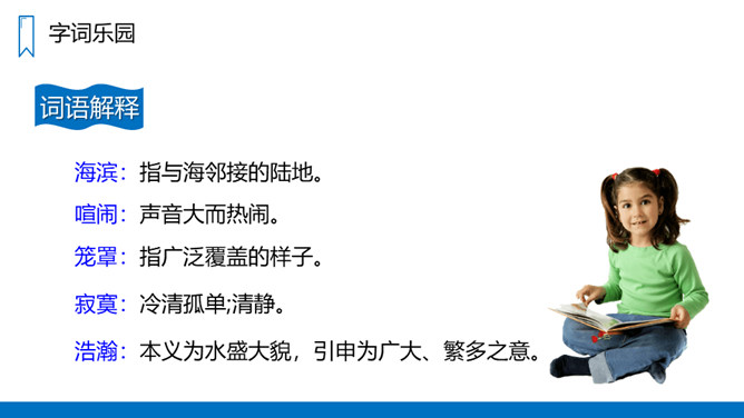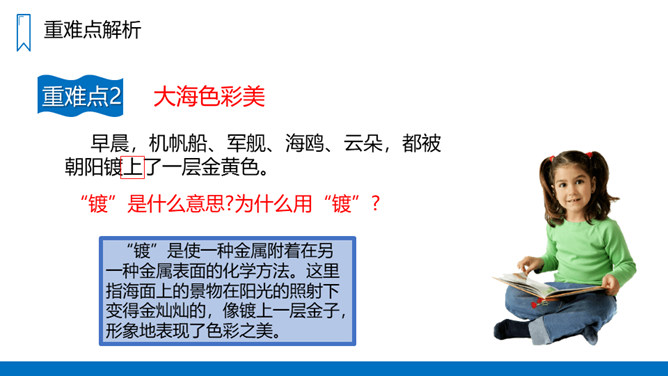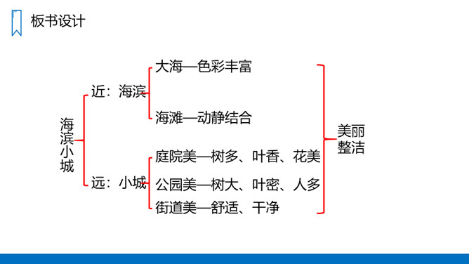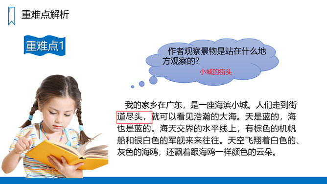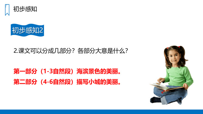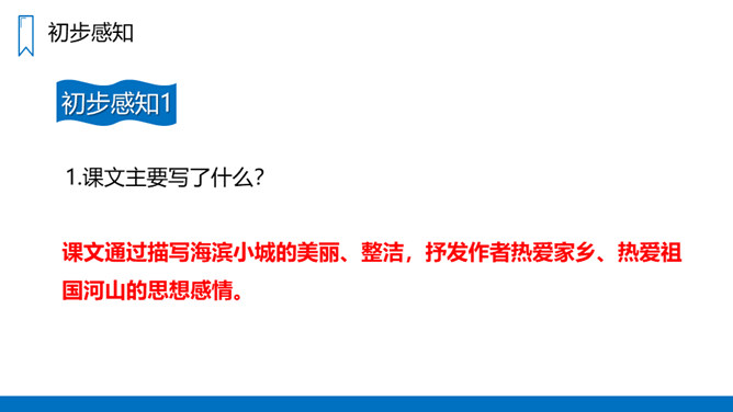 蓝色的大海,蓝色的天,银白色的军舰,白色的或灰色的海鸥;各种颜色各种花纹的贝壳……这一切是多么美丽、多么诱人啊!我们一起走进这具有南国风光的美丽的海滨小城来看看吧!课文主要写了什么?课文通过描写海滨小城的美丽、整洁,抒发作者热爱家乡、热爱祖国河山的思想感情。课文可以分成几部分?各部分大意是什么?第一部分(1-3自然段)海滨景色的美丽。第二部分(4-6自然段)描写小城的美丽。所属专题:滨海小城ppt。