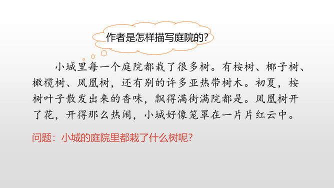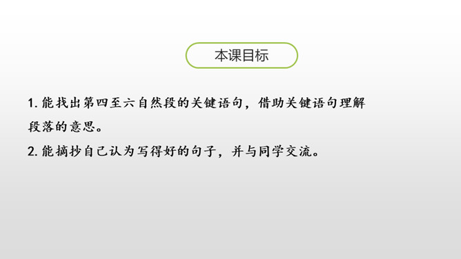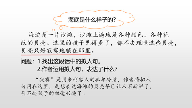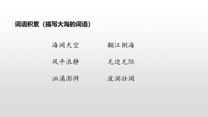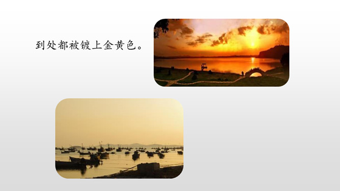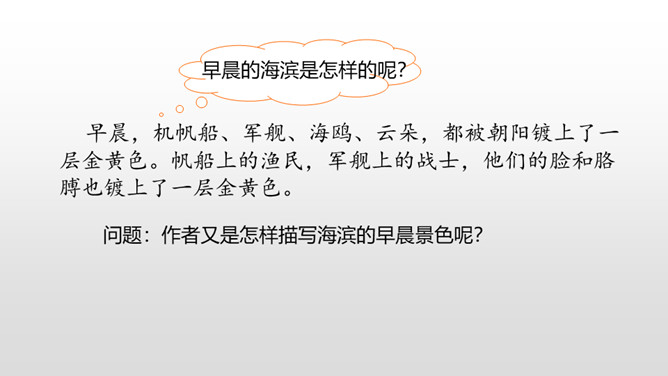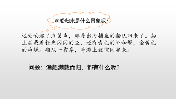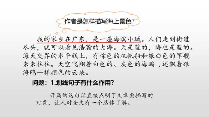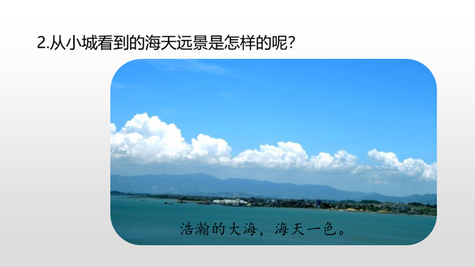 本课目标:1.能找出第四至六自然段的关键语句,借助关键语句理解段落的意思。2.能摘抄自己认为写得好的句子,并与同学交流。1.划线句子有什么作用?开篇的这句话直接点明了文章要描写的对象,让人对全文有一个总体了解。从小城看到的海天远景是怎样的呢?问题:作者又是怎样描写海滨的早晨景色呢?问题:1.找出这段话中的拟人句。2.作者运用拟人句,表达了什么?问题:渔船满载而归,都有什么呢?所属专题:滨海小城ppt。