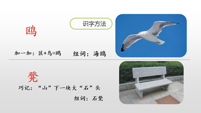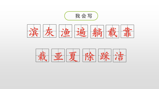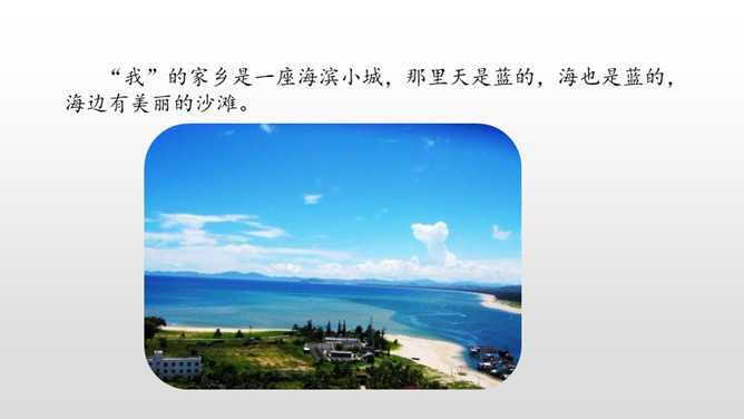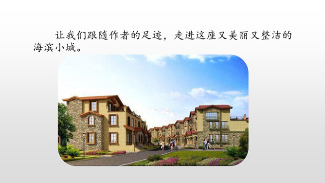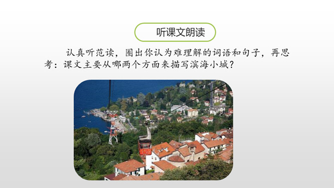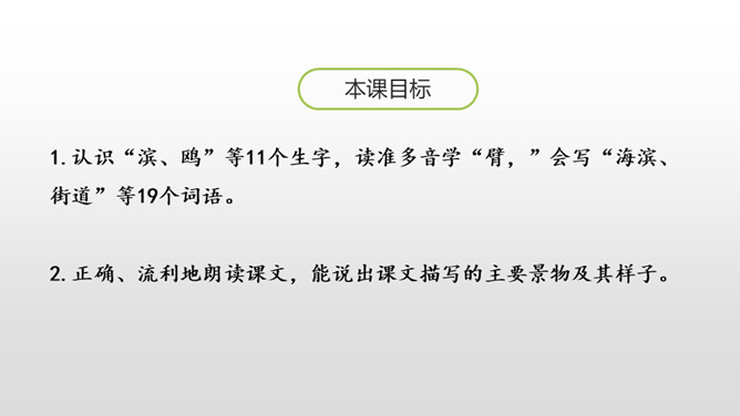 本课目标:1.认识“滨、鸥”等11个生字,读准多音学“臂,”会写“海滨、街道”等19个词语。2.正确、流利地朗读课文,能说出课文描写的主要景物及其样子。认真听范读,圈出你认为难理解的词语和句子,再思考:课文主要从哪两个方面来描写滨海小城?浩瀚:本文形容水势盛大。笼罩:像笼子似的罩在上面。密不透风:本文指枝叶长得很茂密,连风都透不进来。课文是从哪两个方面来描写滨海小城?所属专题:滨海小城ppt。