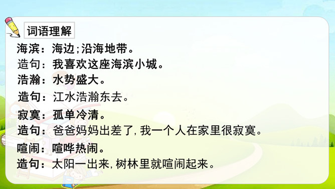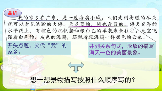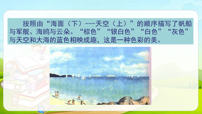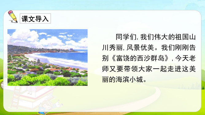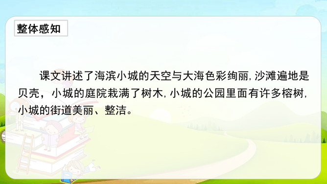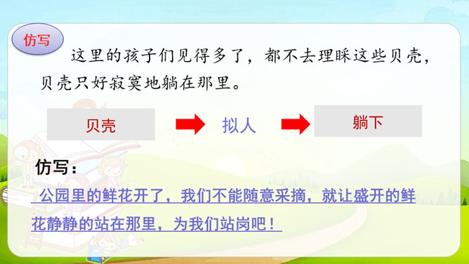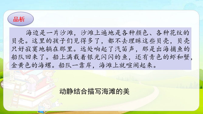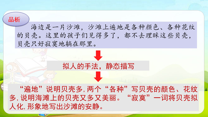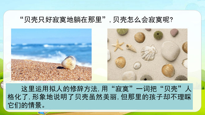 “遍地”说明贝壳多,两个“各种”写贝壳的颜色、花纹多,说明海滩上的贝壳又多又美丽。“寂寞”一词将贝壳拟人化,形象地写出沙滩的安静。这里运用拟人的修辞方法,用“寂寞”一词把“贝壳”人格化了,形象地说明了贝壳虽然美丽,但那里的孩子却不理睬它们的情景。用了列举的方法。写桉树的香味浓,用了一个动词“飘”,让人感觉香味随风弥散,沁人心脾。写凤凰树开花热闹,用了一个比喻句,将开得热闹的凤凰树的花比作一片片红云,突出了凤凰花的艳丽与繁多。所属专题:滨海小城ppt。