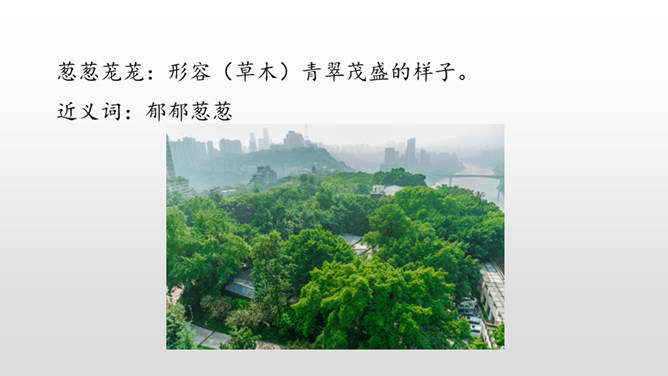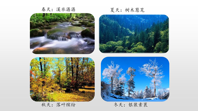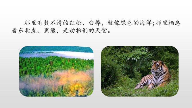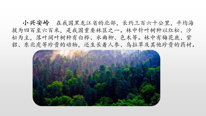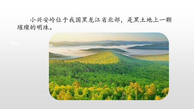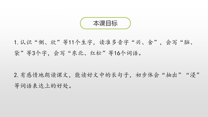 1.认识“侧、欣”等11个生字,读准多音字“兴、舍”,会写“脑、袋”等3个字,会写“东北、红松”等16个词语。2.有感情地朗读课文,能读好文中的长句子,初步体会“抽出”“浸”等词语表达上的好处。葱葱茏茏:形容(草木)青翠茂盛的样子。近义词:郁郁葱葱。严严实实:物体之间靠得很近,没有空隙。课文是按照什么顺序描写小兴安岭的?春、夏、秋、冬一年四季的顺序。融化:(冰、雪等)变成水。反义词:凝结。所属专题:美丽的小兴安岭ppt。