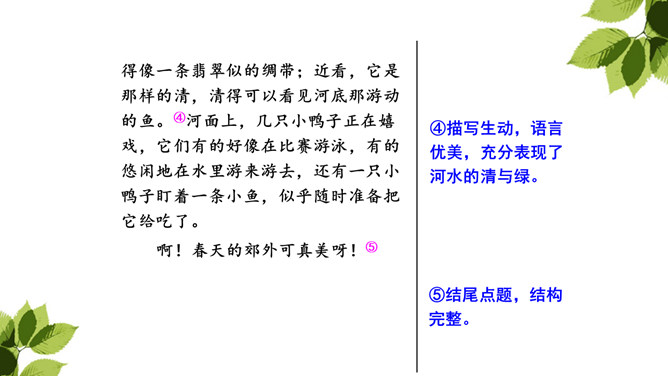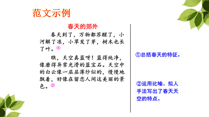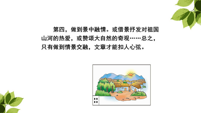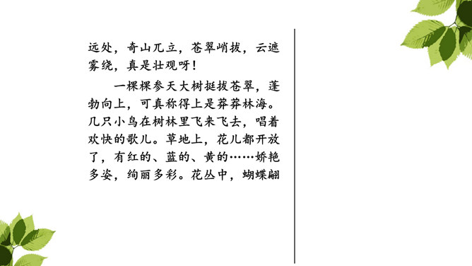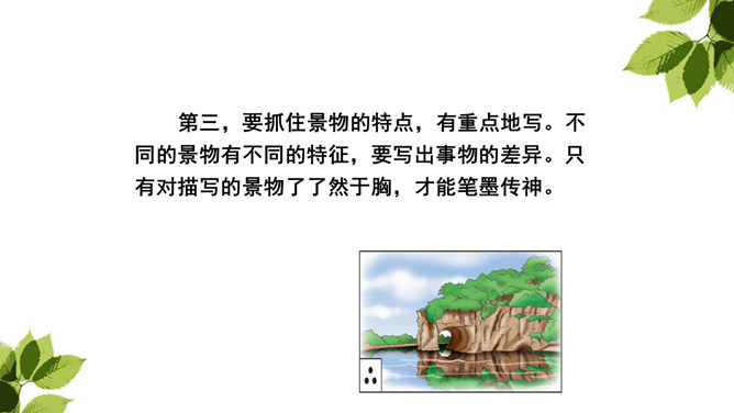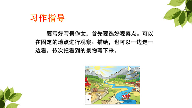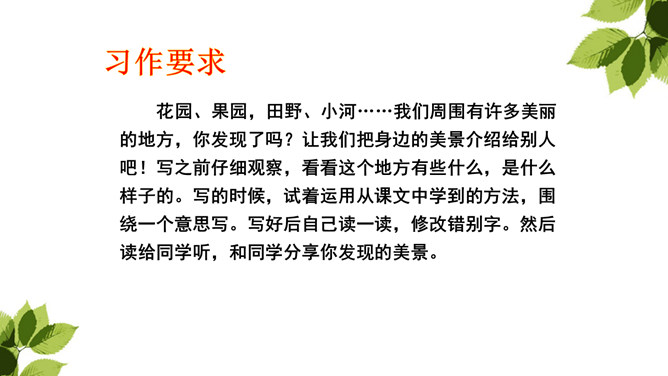 花园、果园,田野、小河……我们周围有许多美丽的地方,你发现了吗?让我们把身边的美景介绍给别人吧!写之前仔细观察,看看这个地方有些什么,是什么样子的。写的时候,试着运用从课文中学到的方法,围绕一个意思写。写好后自己读一读,修改错别字。然后读给同学听,和同学分享你发现的美景。要写好写景作文,首先要选好观察点。可以在固定的地点进行观察、描绘,也可以一边走一边看,依次把看到的景物写下来。所属专题:这儿真美ppt。