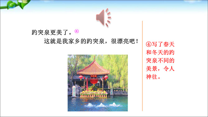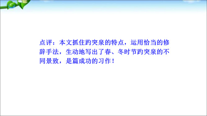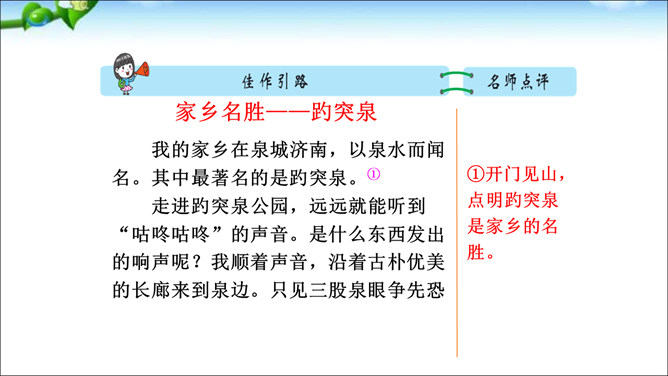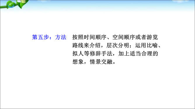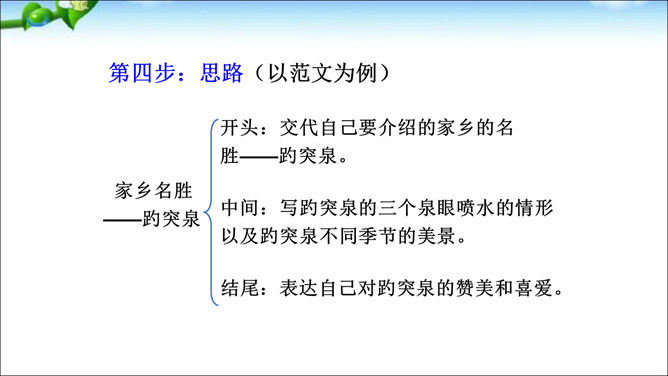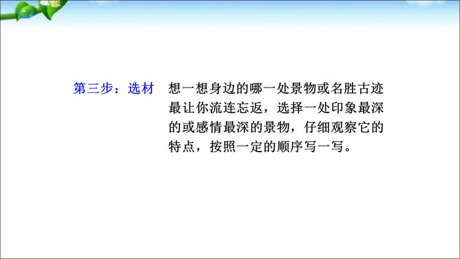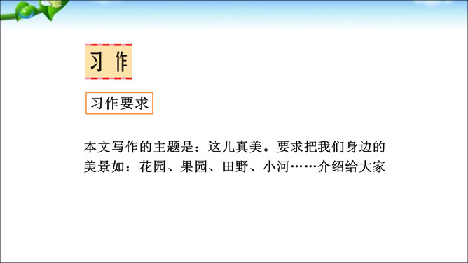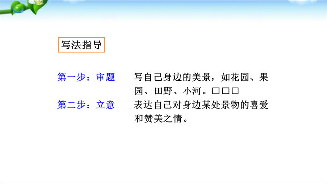 本文写作的主题是:这儿真美。要求把我们身边的美景如:花园、果园、田野、小河……介绍给大家。第一步:审题 写自己身边的美景,如花园、果 园、田野、小河。第二步:立意 表达自己对身边某处景物的喜爱 和赞美之情。第三步:选材 想一想身边的哪一处景物或名胜古迹最让你流连忘返,选择一处印象最深的或感情最深的景物,仔细观察它的特点,按照一定的顺序写一写。所属专题:这儿真美ppt。