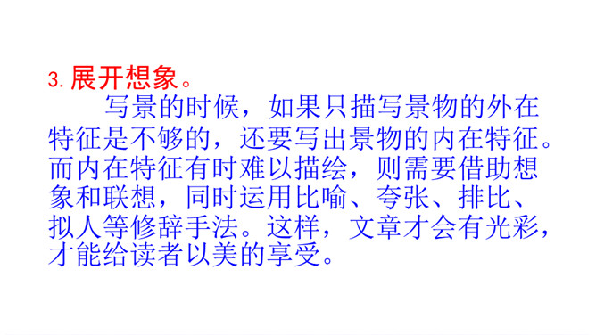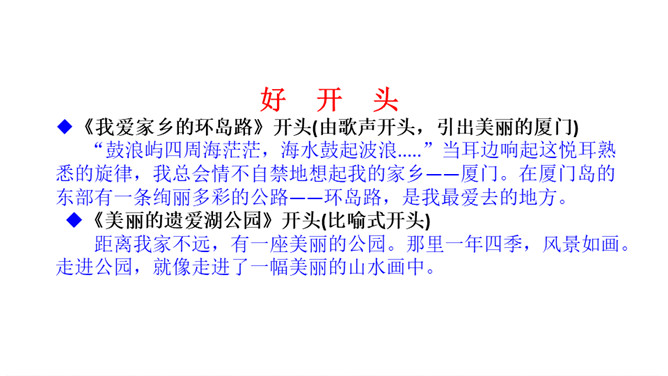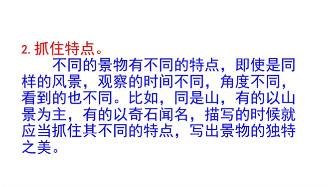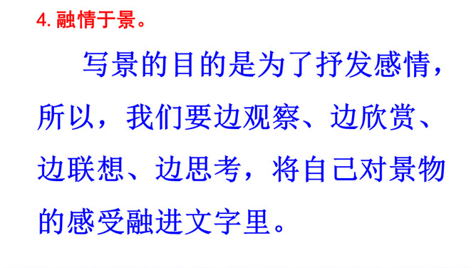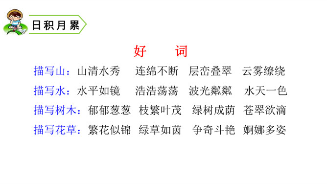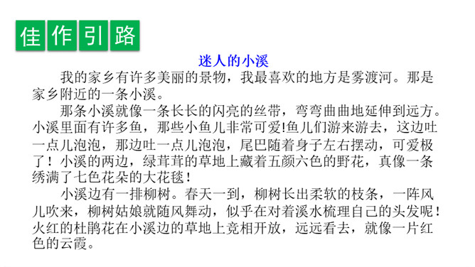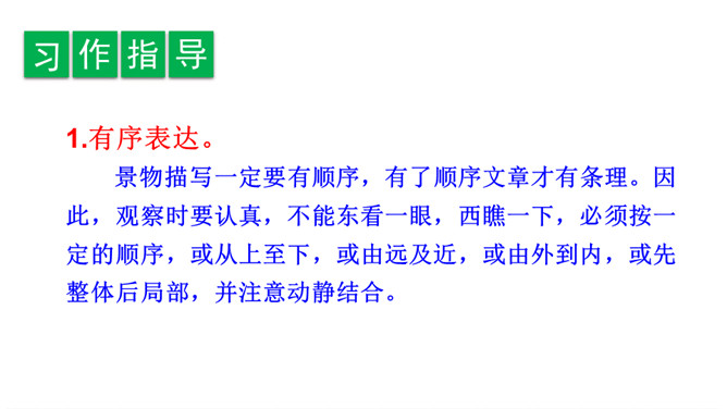 我们周围有许多美丽的地方,你发现了吗?仔细观察,把身边的美景介绍给别人吧!写的时候,试着运用从课文中学到的方法,围绕一个意思写,并尽可能用上最近学到的描写景物的词语。景物描写一定要有顺序,有了顺序文章才有条理。因此,观察时要认真,不能东看一眼,西瞧一下,必须按一定的顺序,或从上至下,或由远及近,或由外到内,或先整体后局部,并注意动静结合。所属专题:这儿真美ppt。