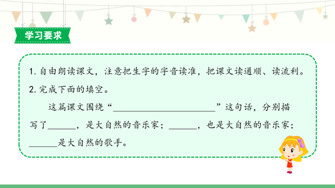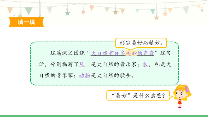 在美丽的大自然里,你听到了什么呢?你知道“呢”的另一个读音吗?这篇课文围绕“大自然有许多美妙的声音”这句话,分别描写了风,是大自然的音乐家;水,也是大自然的音乐家;动物是大自然的歌手。“美妙”是什么意思?自由朗读课文,注意把生字的字音读准,把课文读通顺、读流利。完成下面的填空。所属专题:大自然的声音ppt。
