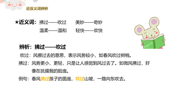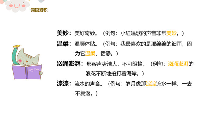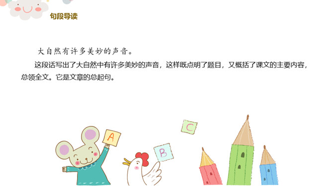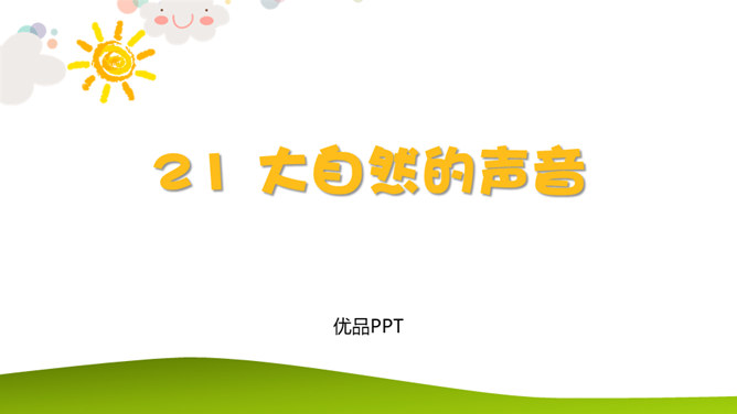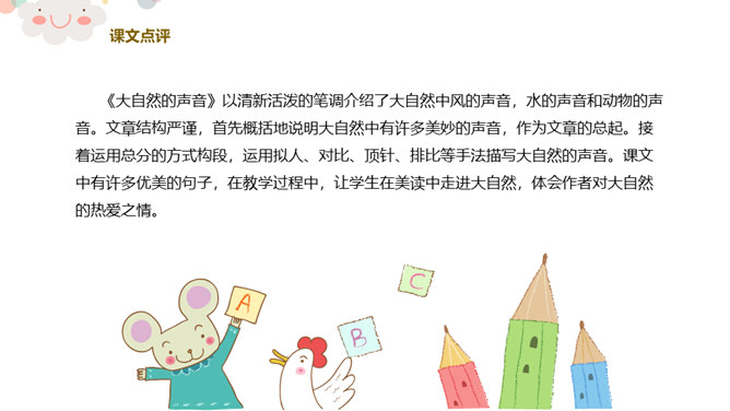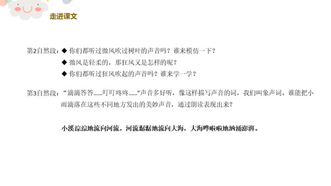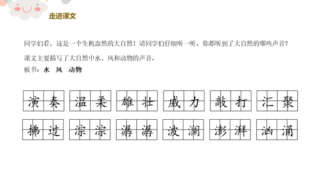 同学们看,这是一个生机盎然的大自然!请同学们仔细听一听,你都听到了大自然的哪些声音?课文主要描写了大自然中水、风和动物的声音。第2自然段:你们都听过微风吹过树叶的声音吗?谁来模仿一下?微风是轻柔的,那狂风又是怎样的呢?你们都听过狂风吹起的声音吗?谁来学一学?第3自然段:“滴滴答答……叮叮咚咚……”声音多好听,像这样描写声音的词,我们叫象声词。谁能把小雨滴落在这些不同地方发出的美妙声音,通过朗读表现出来?所属专题:大自然的声音ppt。
