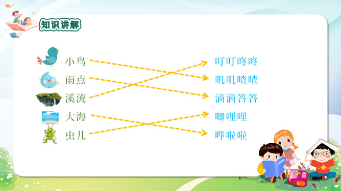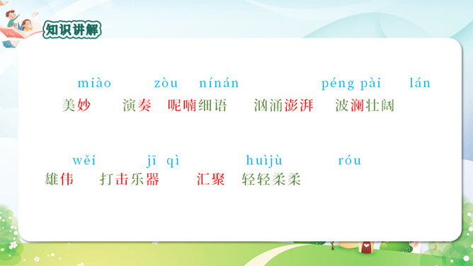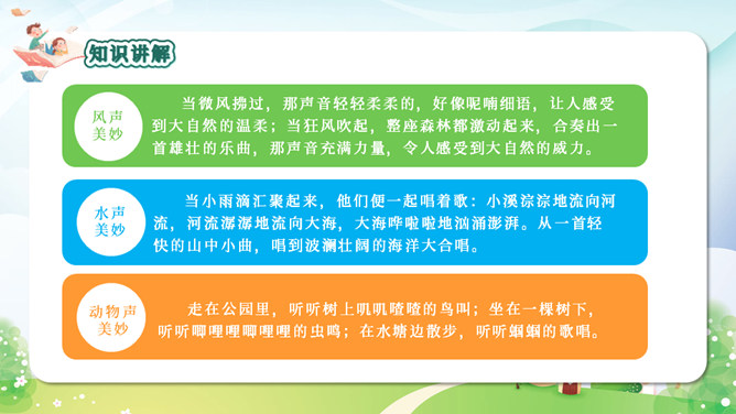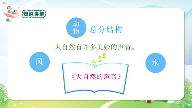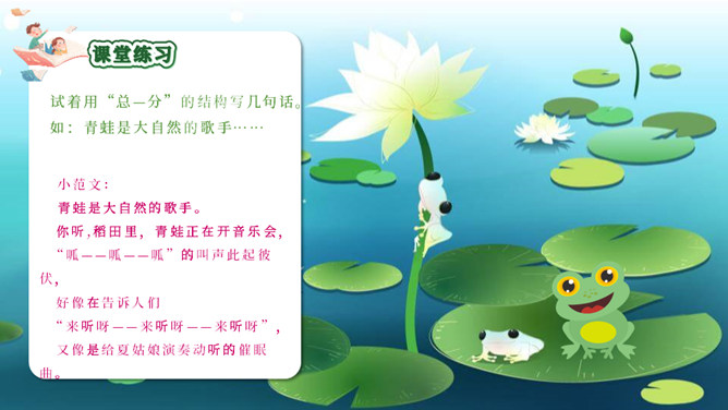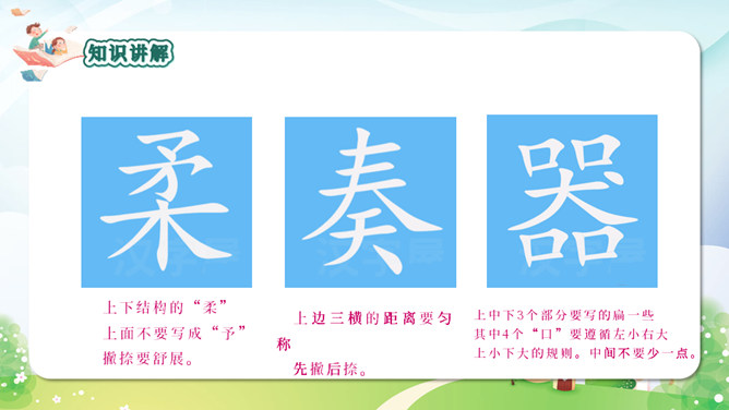 试着用“总—分”的结构写几句话。如:青蛙是大自然的歌手……小范文:青蛙是大自然的歌手。你听,稻田里,青蛙正在开音乐会,“呱——呱——呱”的叫声此起彼伏,好像在告诉人们“来听呀——来听呀——来听呀”,又像是给夏姑娘演奏动听的催眠曲。 上下结构的“柔”上面不要写成“予”撇捺要舒展。上边三横的距离要匀称,先撇后捺。上中下3个部分要写的扁一些其中4个“口”要遵循左小右大上小下大的规则。中间不要少一点。所属专题:大自然的声音ppt。
