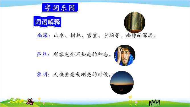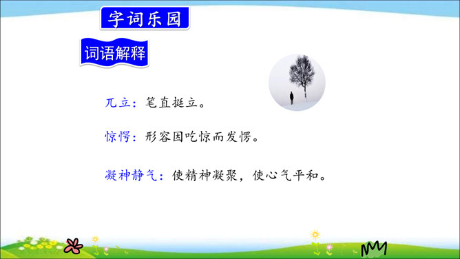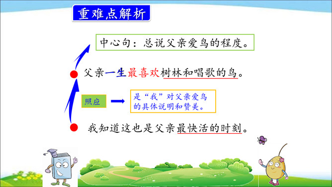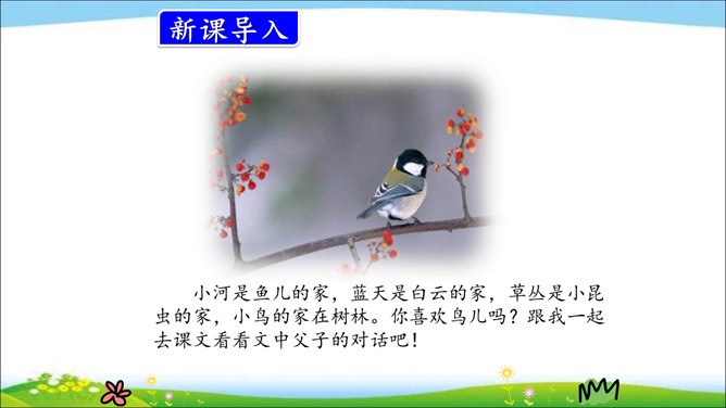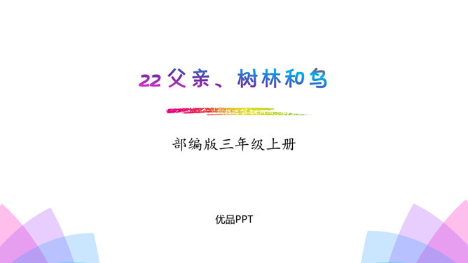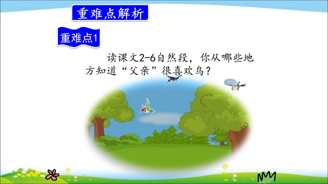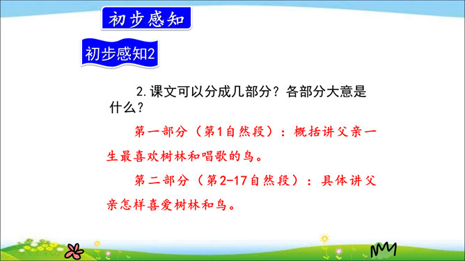 小河是鱼儿的家,蓝天是白云的家,草丛是小昆虫的家,小鸟的家在树林。你喜欢鸟儿吗?跟我一起去课文看看文中父子的对话吧!课文通过“我”和父亲关于鸟的对话,让我们了解到父亲对鸟的熟悉与热爱,这种爱也感染了“我”,使“我”有了爱鸟意识,展现了人与自然的和谐与融洽。第一部分(第1自然段):概括讲父亲一生最喜欢树林和唱歌的鸟。第二部分(第2-17自然段):具体讲父亲怎样喜爱树林和鸟。所属专题:父亲树林和鸟ppt。