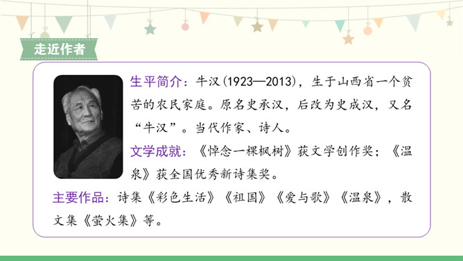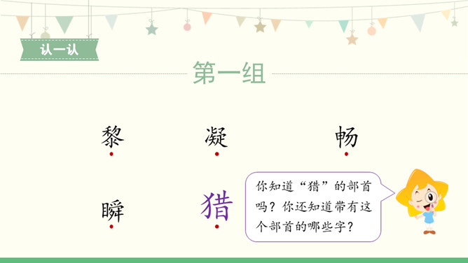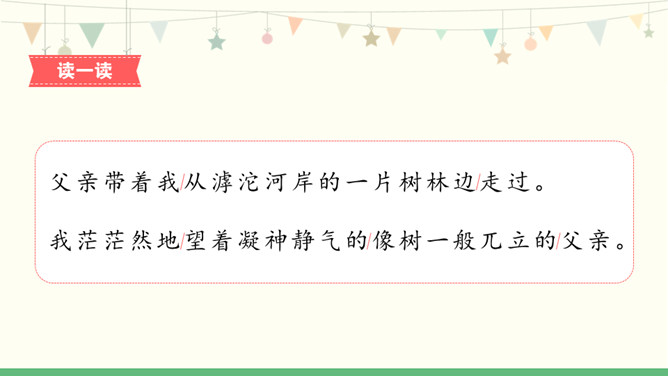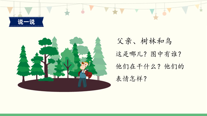 这是哪儿?图中有谁?他们在干什么?他们的表情怎样?学习要求:1.自由朗读课文,注意把生字字音读准,把课文读通顺,读流利。2.思考课文主要讲了一件什么事?你能快速默读全文后,在文中找一个句子来概括课文的主要内容吗?“最喜欢”说明不是一般地喜欢,父亲喜欢“树林和歌唱的鸟”超过其他喜爱的事物。你知道“猎”的部首吗?你还知道带有这个部首的哪些字?所属专题:父亲树林和鸟ppt。