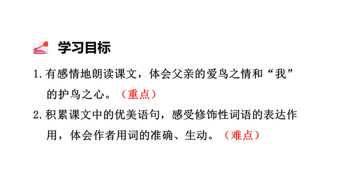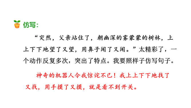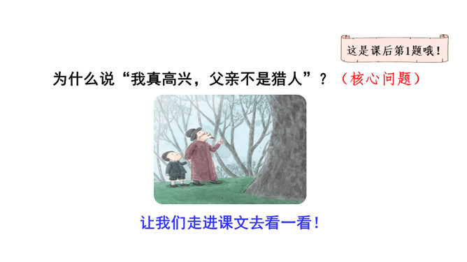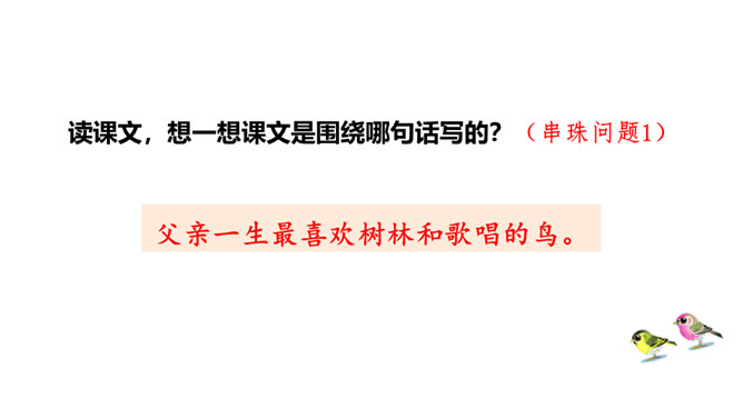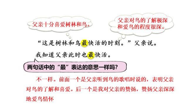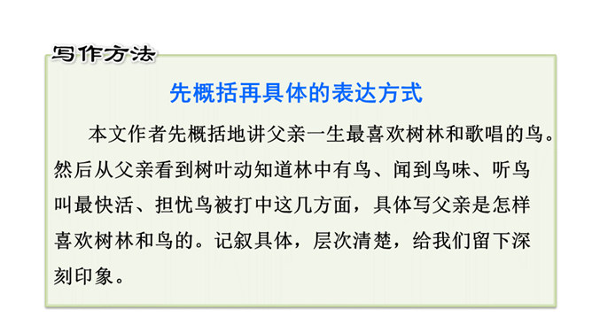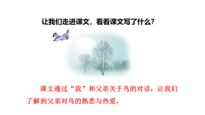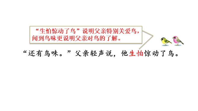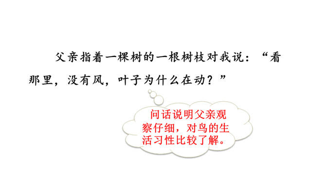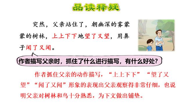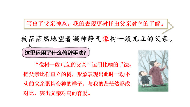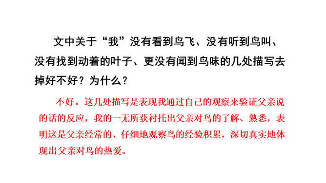 作者抓住父亲的动作描写,“上上下下” “望了又望”“闻了又闻”形象的表现出父亲观察得非常仔细,也说明父亲对树林和鸟十分熟悉,为下文做出铺垫。 “像树一般兀立的父亲”运用比喻的手法,把父亲比作直立的树,形象表现出此时一动不动的父亲聚精会神的样子,与我的茫茫然形成对比,突出父亲对鸟的喜爱。文中关于“我”没有看到鸟飞、没有听到鸟叫、没有找到动着的叶子、更没有闻到鸟味的几处描写去掉好不好?为什么?所属专题:父亲树林和鸟ppt。