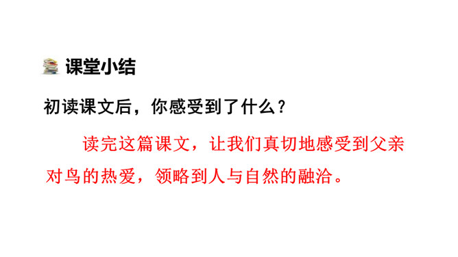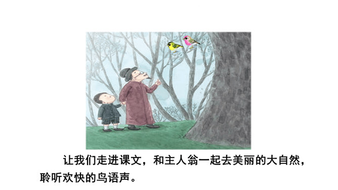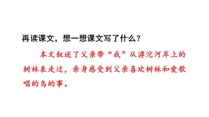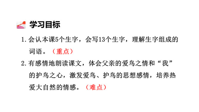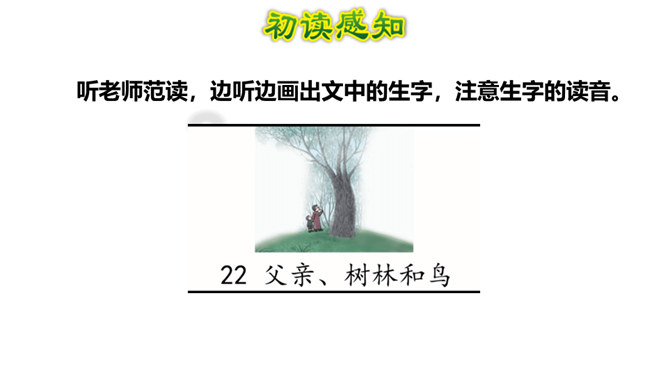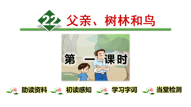 让我们走进课文,和主人翁一起去美丽的大自然,聆听欢快的鸟语声。1.会认本课5个生字,会写13个生字,理解生字组成的词语。(重点)2.有感情地朗读课文,体会父亲的爱鸟之情和“我”的护鸟之心,激发爱鸟、护鸟的思想感情,培养热爱大自然的情感。(难点)读课文,想一想课文写了什么?本文叙述了父亲带“我”从滹沱河岸上的树林表走过,亲身感受到父亲喜欢树林和爱歌唱的鸟的事。书写指导:“及”左边横折折撇的第二个折的横要短。捺在左边撇的中间位置起笔。所属专题:父亲树林和鸟ppt。