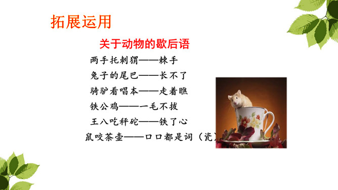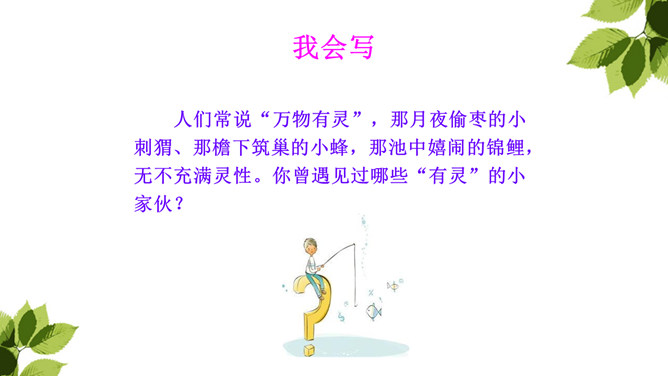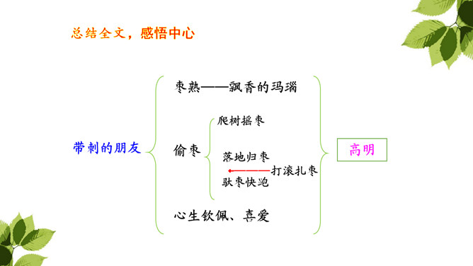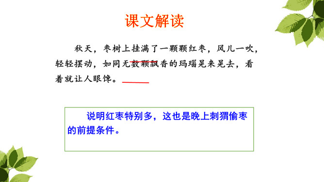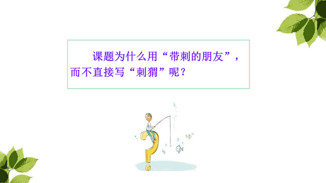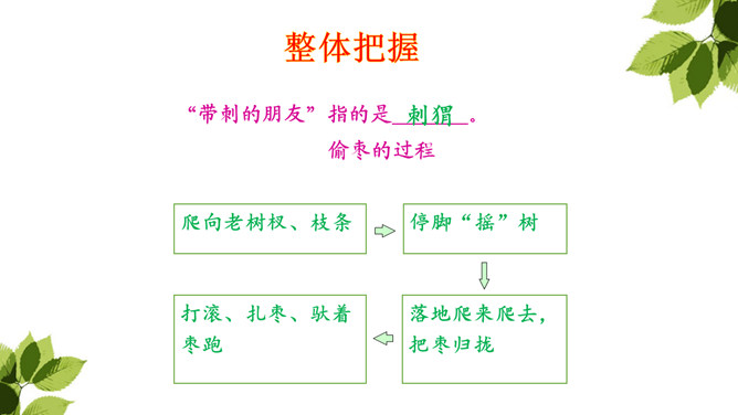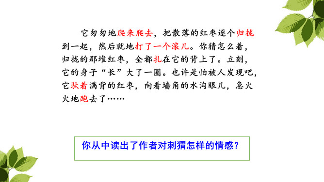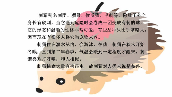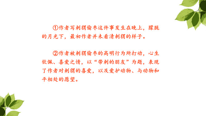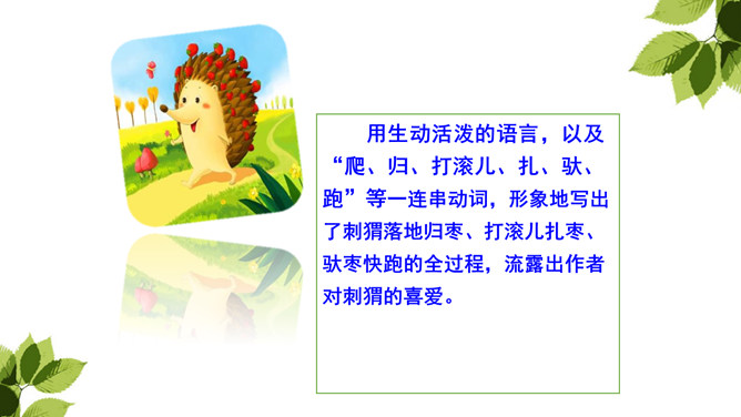 “那个东西”是“我”开始发现圆乎乎的东西爬树时对刺猬的称呼,此时“我”并未弄明白刺猬的意图,对它的行为感到惊讶。当“我”明白刺猬是在“摇枣”,从树上掉下来时,对它心生怜惜,也有些着急,叫它“那个家伙”,流露出“我”对刺猬的担心。“我”在目睹了刺猬归枣、扎枣、驮枣的过程后,对刺猬的高明本事不由得心生钦佩,对这个聪明的“小东西”喜爱不已。原文除了写刺猬偷枣,还写了小刺猬一家的很多故事。所属专题:带刺的朋友ppt。