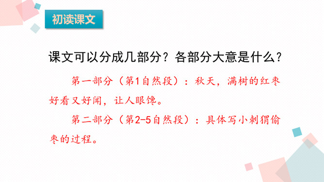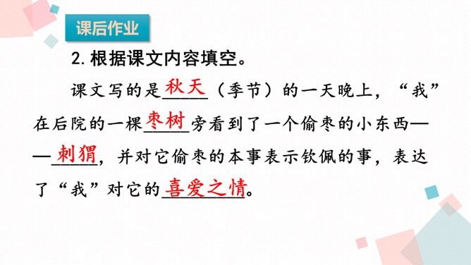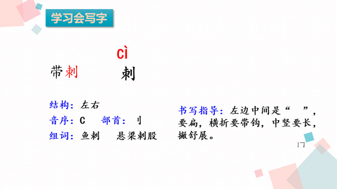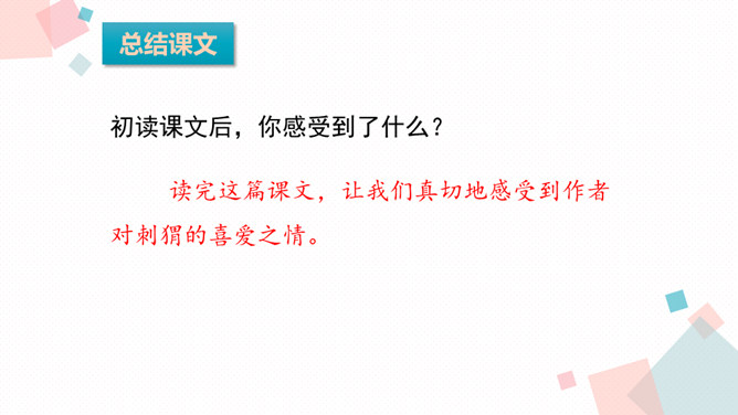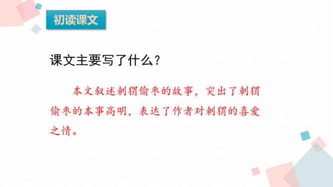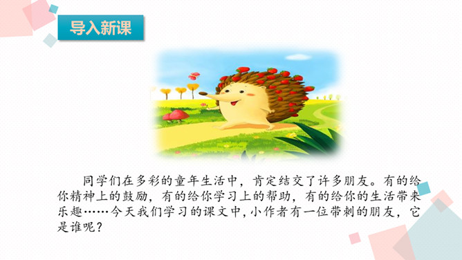 同学们在多彩的童年生活中,肯定结交了许多朋友。有的给你精神上的鼓励,有的给你学习上的帮助,有的给你的生活带来乐趣……今天我们学习的课文中,小作者有一位带刺的朋友,它是谁呢?1.会认本课11个生字,会写13个生字,认识多音字“扎”,理解生字组成的词语2.有感情地朗读课文,初步感知文意,了解课文内容。 本文叙述刺猬偷枣的故事,突出了刺猬偷枣的本事高明,表达了作者对刺猬的喜爱之情。所属专题:带刺的朋友ppt。