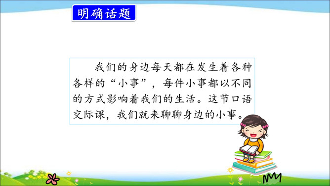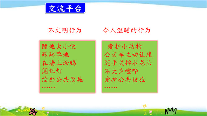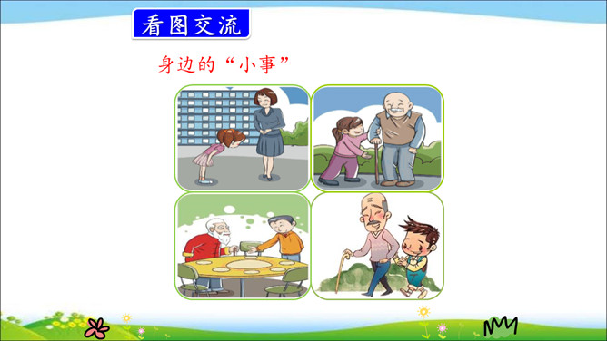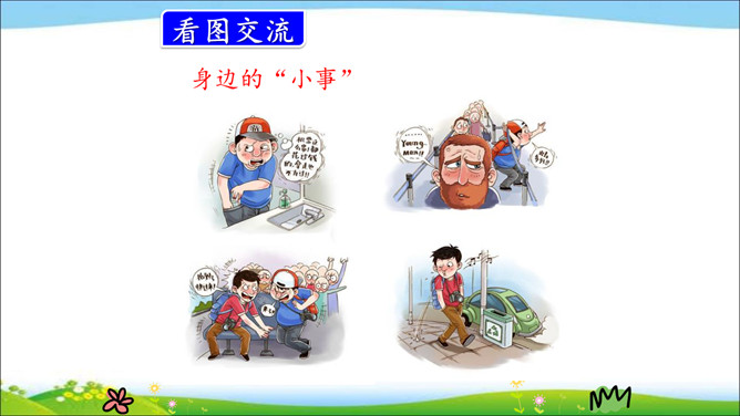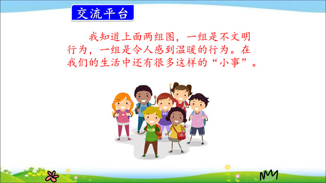 我们的身边每天都在发生着各种各样的“小事”,每件小事都以不同的方式影响着我们的生活。这节口语交际课,我们就来聊聊身边的小事。用简要的话表达清楚自己的看法。汇总小组意见时,尽可能反映每个人的想法。我知道上面两组图,一组是不文明行为,一组是令人感到温暖的行为。在我们的生活中还有很多这样的“小事”。如果不遵守游戏规则,朋友就不会欢迎你;如果不遵守道不文明德规则,就不会受到别人的尊重。