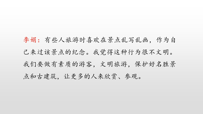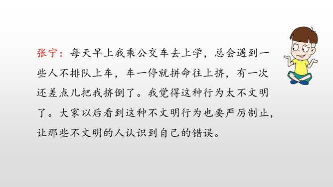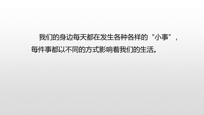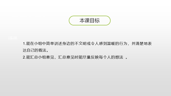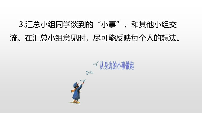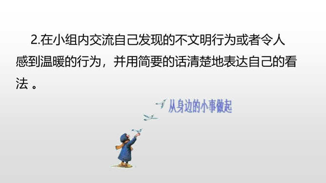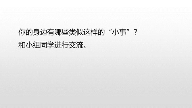 本课目标:1.能在小组中简单讲述身边的不文明或令人感到温暖的行为,并清楚地表达自己的看法。2.能汇总小组意见,汇总意见时能尽量反映每个人的想法 。我们的身边每天都在发生各种各样的“小事”,每件事都以不同的方式影响着我们的生活。你的身边有哪些类似这样的“小事”?和小组同学进行交流。在交际前,留心观察生活,特别是自己周围的人和事,收集同学们都感兴趣的话题交流。