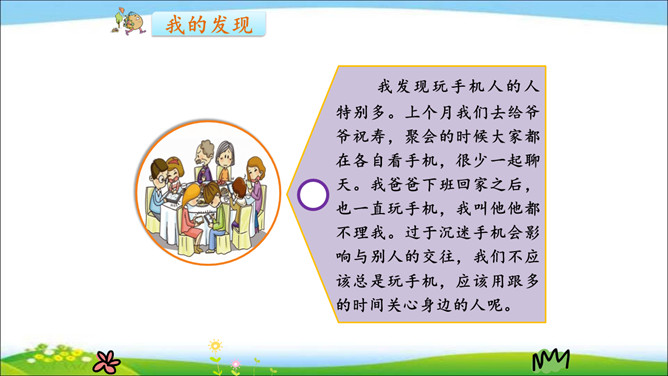 我发现玩手机人的人特别多。上个月我们去给爷爷祝寿,聚会的时候大家都在各自看手机,很少一起聊天。我爸爸下班回家之后,也一直玩手机,我叫他他都不理我。过于沉迷手机会影响与别人的交往,我们不应该总是玩手机,应该用跟多的时间关心身边的人呢。最近我一直在想,我们班能不能成立一个图书角呢?我们班爱读书的同学挺多的,每个同学家里都有很多读过的旧书。这些书放在家里不能发挥作用,太可惜了。如果班里成立一个图书角,每个同学都从读过的书中选出几本放在图书角,这样就能发挥这些书的作用,让大家读到更多的书。所属专题:我有一个想法ppt。