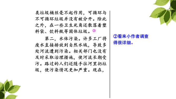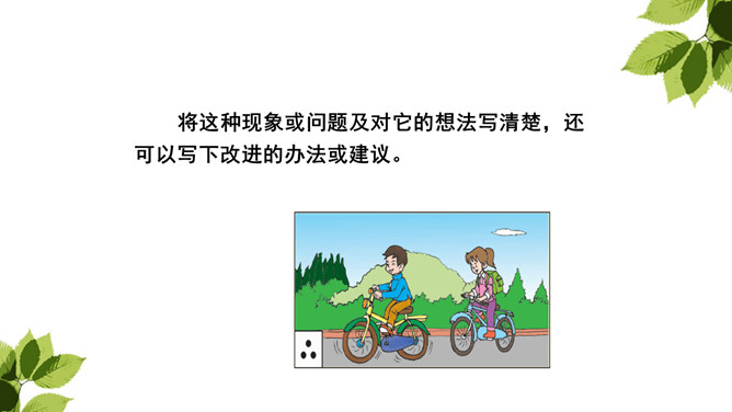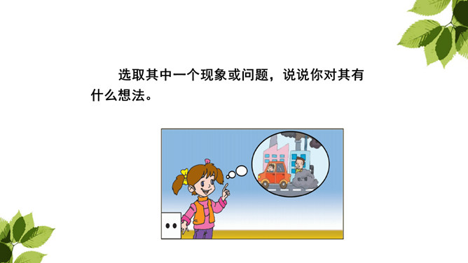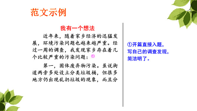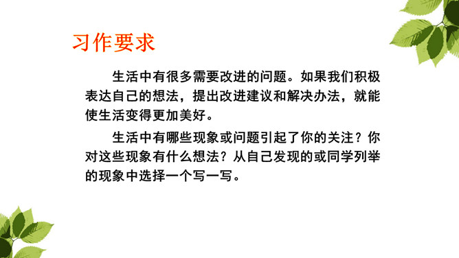 生活中有哪些现象或问题引起了你的关注?你对这些现象有什么想法?从自己发现的或同学列举的现象中选择一个写一写。生活中有很多需要改进的问题。如果我们积极表达自己的想法,提出改进建议和解决办法,就能使生活变得更加美好。列举生活中引起你的关注的现象或者问题。选取其中一个现象或问题,说说你对其有什么想法。将这种现象或问题及对它的想法写清楚,还可以写下改进的办法或建议。所属专题:我有一个想法ppt。