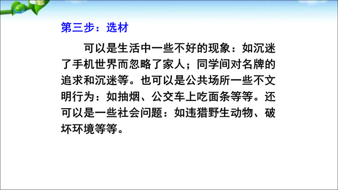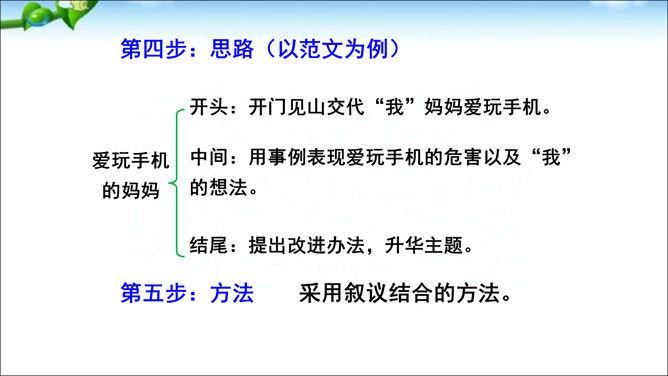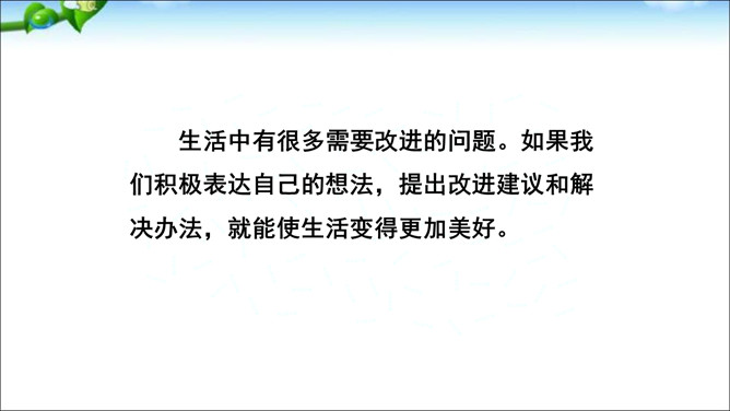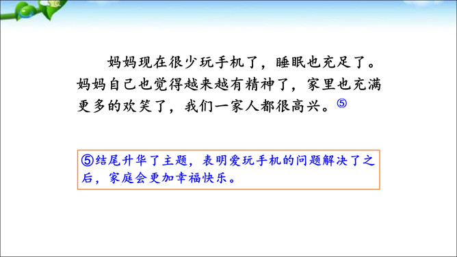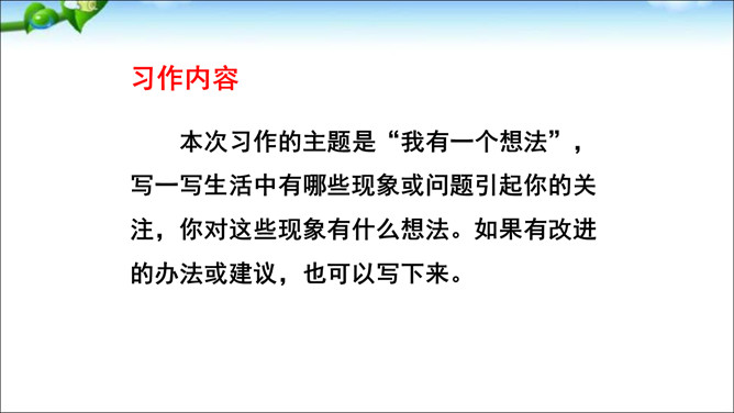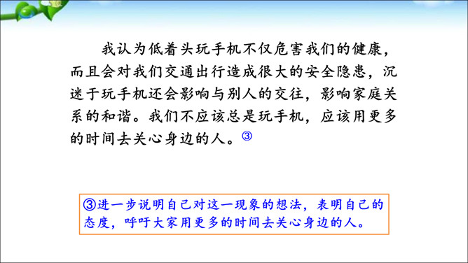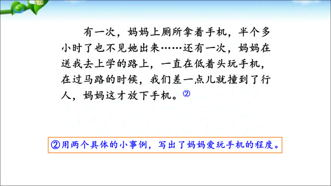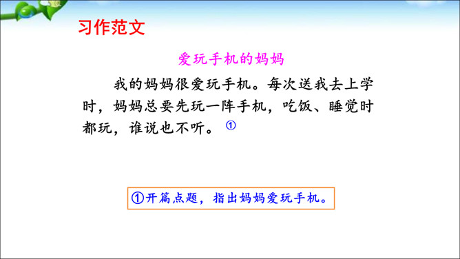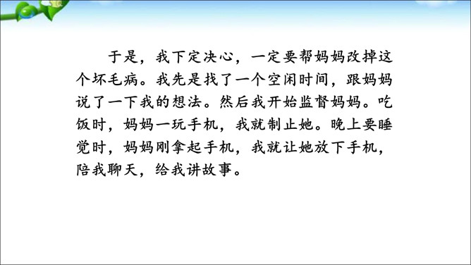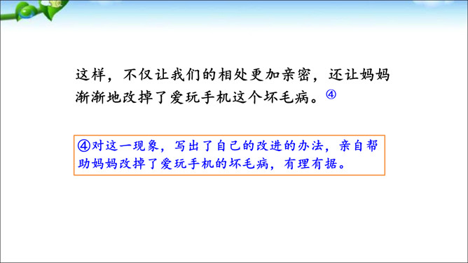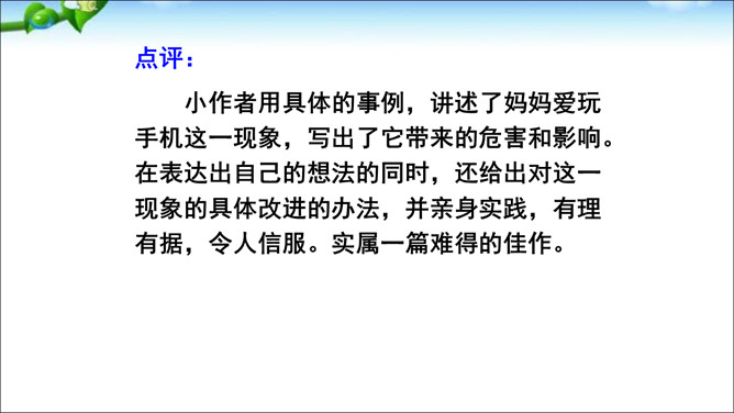 小作者用具体的事例,讲述了妈妈爱玩手机这一现象,写出了它带来的危害和影响。在表达出自己的想法的同时,还给出对这一现象的具体改进的办法,并亲身实践,有理有据,令人信服。实属一篇难得的佳作。 生活中有很多需要改进的问题。如果我们积极表达自己的想法,提出改进建议和解决办法,就能使生活变得更加美好。如果有改进的办法或建议,也可以写下来。所属专题:我有一个想法ppt。