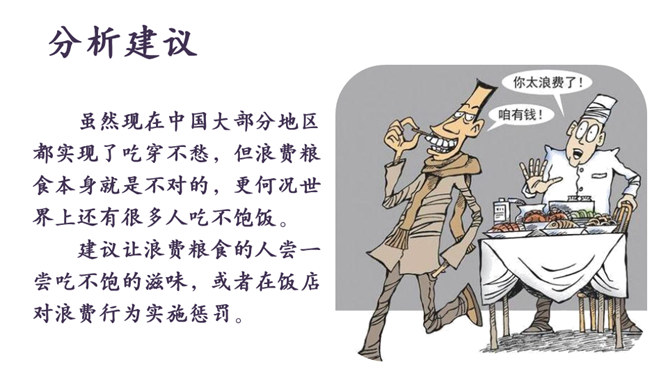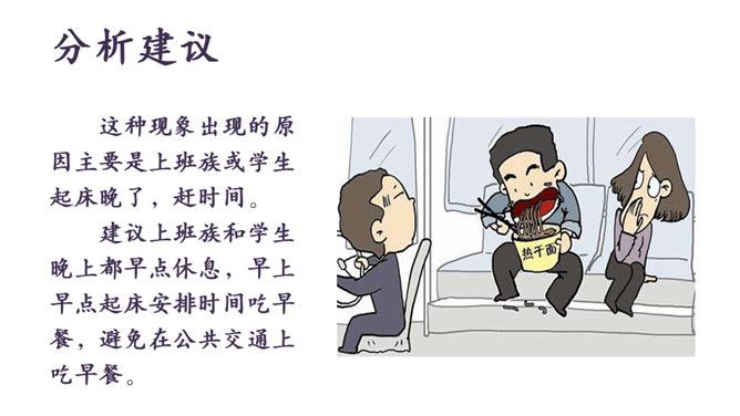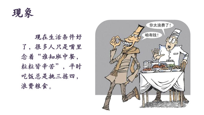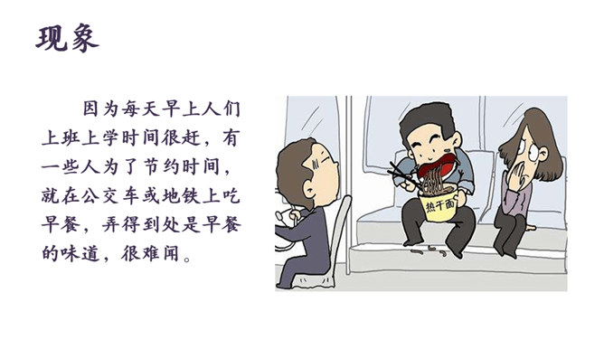 因为每天早上人们上班上学时间很赶,有一些人为了节约时间,就在公交车或地铁上吃早餐,弄得到处是早餐的味道,很难闻。有一些家庭的老人溺爱孩子,对孩子有求必应,导致一些小朋友调皮捣蛋,不知感恩,不尊重长辈。 现在生活条件好了,很多人只是嘴里念着“谁知班中餐,粒粒皆辛苦”,平时吃饭总是挑三拣四,浪费粮食。针对这种现象做出简要分析(为什么会有这种现象/这种现象会有什么影响等),然后联系实际情况提出改进建议和解决办法。建议和办法一定要切实可行,可以查阅资料。所属专题:我有一个想法ppt。