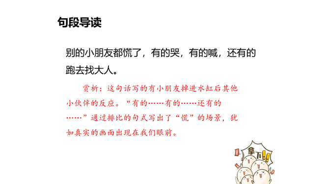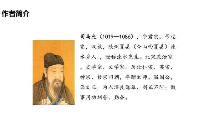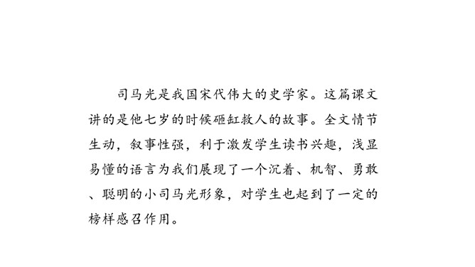 赏析:这句话写的有小朋友掉进水缸后其他小伙伴的反应。“有的……有的……还有的……”通过排比的句式写出了“慌”的场景,犹如真实的画面出现在我们眼前。司马光是我国宋代伟大的史学家。这篇课文讲的是他七岁的时候砸缸救人的故事。全文情节生动,叙事性强,利于激发学生读书兴趣,浅显易懂的语言为我们展现了一个沉着、机智、勇敢、聪明的小司马光形象,对学生也起到了一定的榜样感召作用。所属专题:司马光ppt。