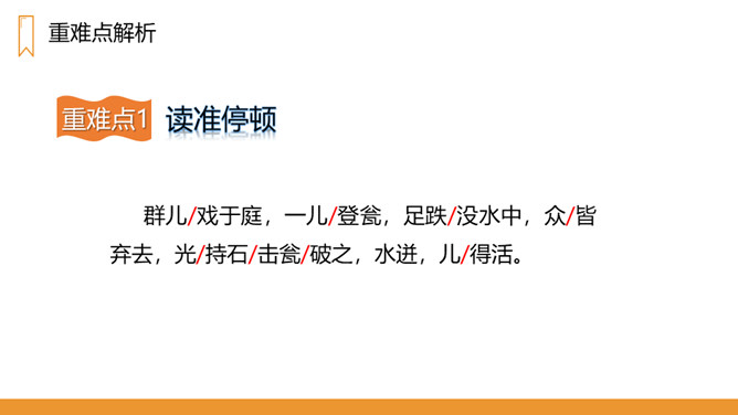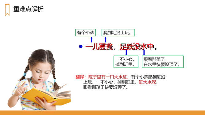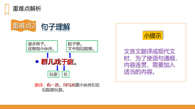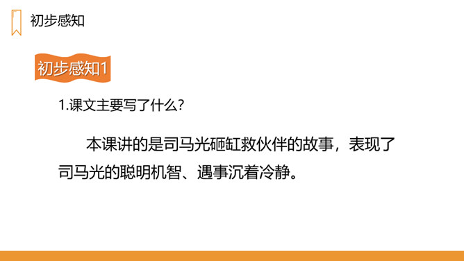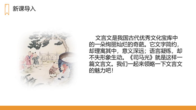 文言文翻译成现代文时,为了使语句通顺、内容连贯,需要加入适当的内容。课文中哪个地方写出了司马光很聪明?课文主要写了什么?本课讲的是司马光砸缸救伙伴的故事,表现了司马光的聪明机智、遇事沉着冷静。小喇叭朗读开始了,点一点音箱,一起听。文言文是我国古代优秀文化宝库中的一朵绚丽灿烂的奇葩。它文字简约,却理寓其中,意义深远;语言凝练,却不失形象生动。我们一起来领略一下文言文的魅力吧!所属专题:司马光ppt。