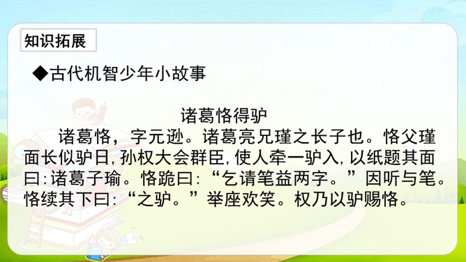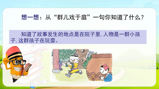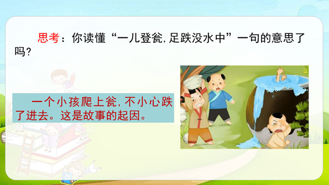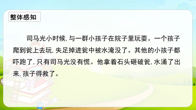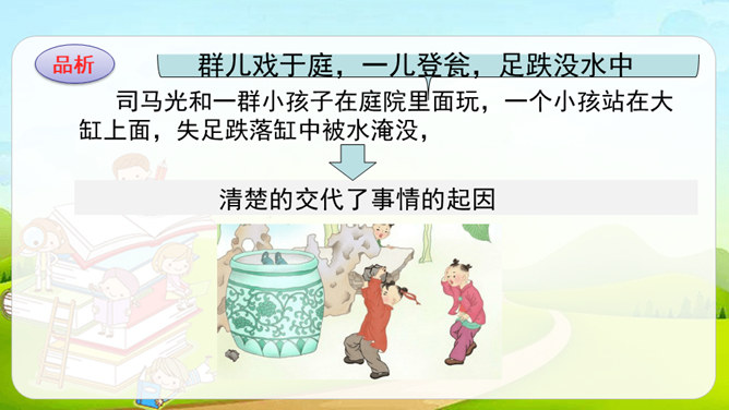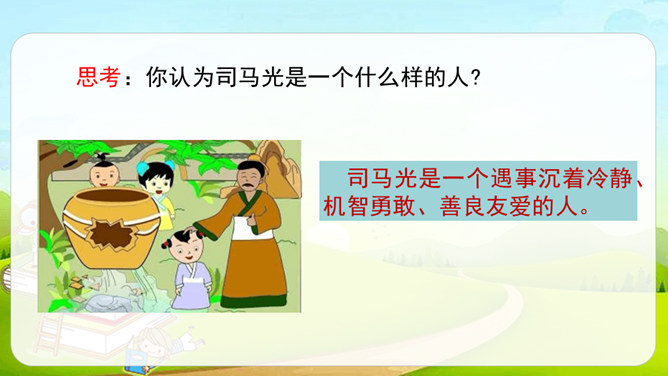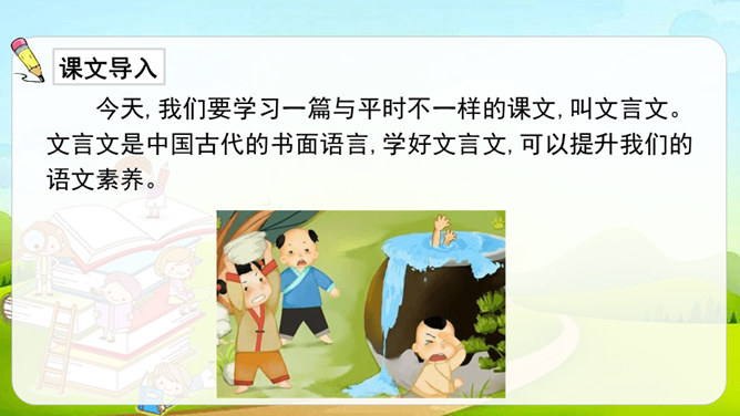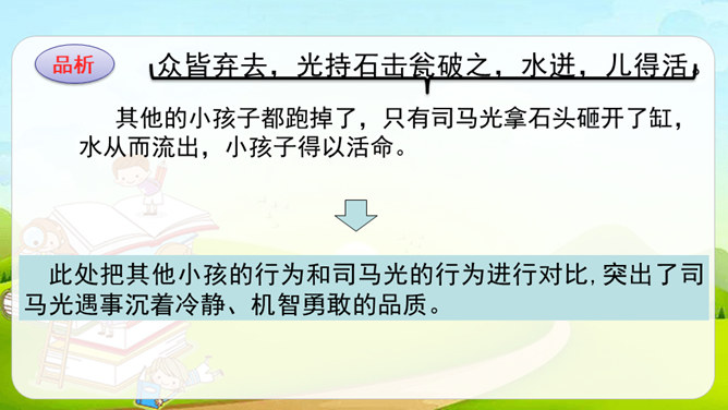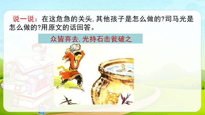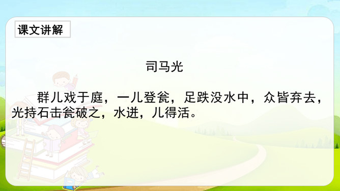 这篇课文是文言文,而我们以前学过的课文多数是现代文。文言文是用古代的语法写的,现代文是用现代的语法写的。它们之间有一些区别:第一,文言文语言精炼、简短,而现代文刚好相反,文章篇幅较长。第二,文言文的概括力强,短短几个字就能表达作者的感受。第三,文言文的一些语句表达顺序与现代文不同。如,“戏于庭”,用现代文来解释是“在庭院里玩耍”,语序和现代文是不同的。所属专题:司马光ppt。