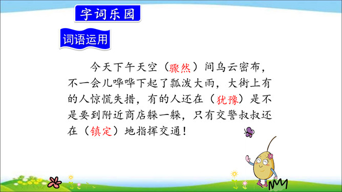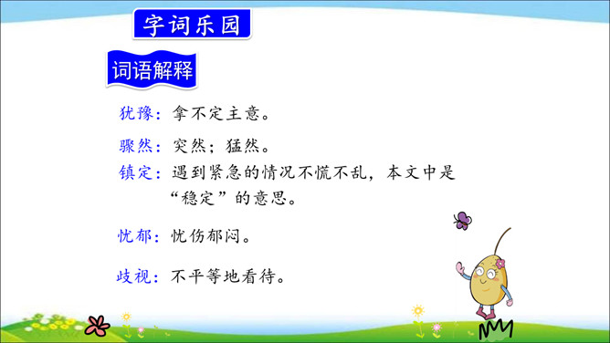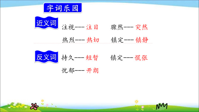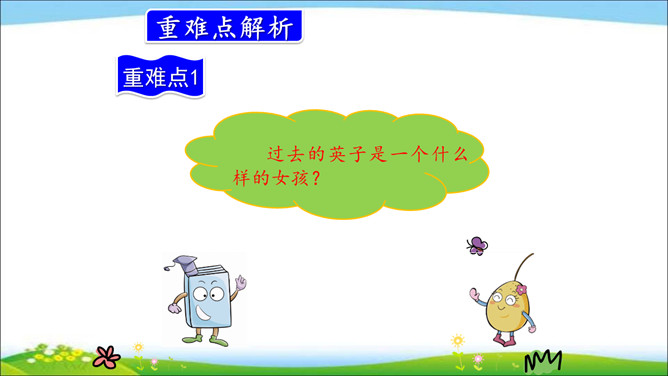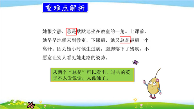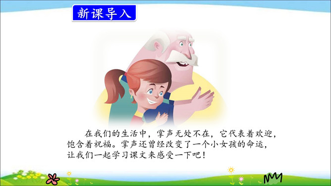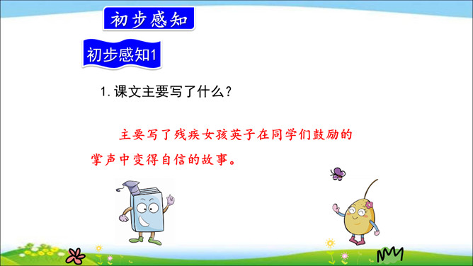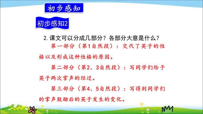 在我们的生活中,掌声无处不在,它代表着欢迎,饱含着祝福。掌声还曾经改变了一个小女孩的命运,让我们一起学习课文来感受一下吧!课文主要写了什么?主要写了残疾女孩英子在同学们鼓励的掌声中变得自信的故事。第一部分(第1自然段):交代了英子的性格以及形成这种性格的原因。第二部分(第2、3自然段):写同学们给予英子两次掌声的经过。第三部分(第4、5自然段):写得到同学们的掌声鼓励后的英子发生的变化。