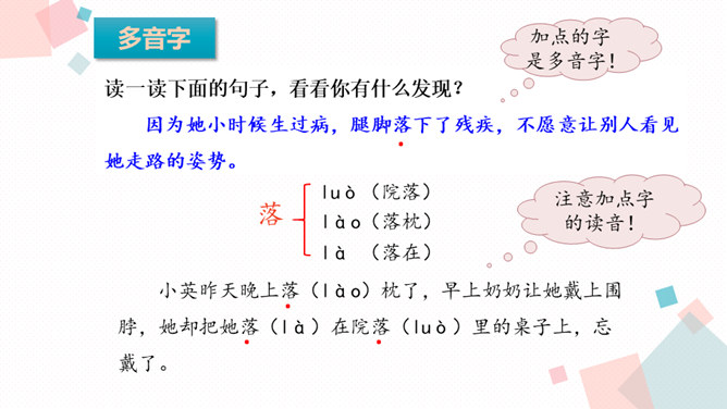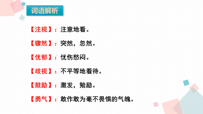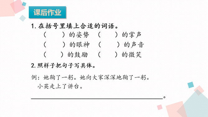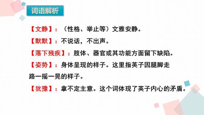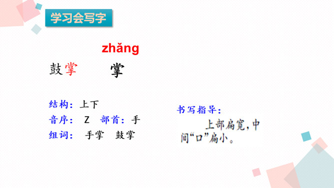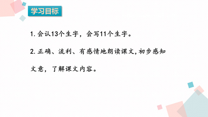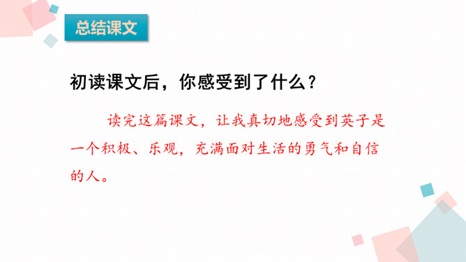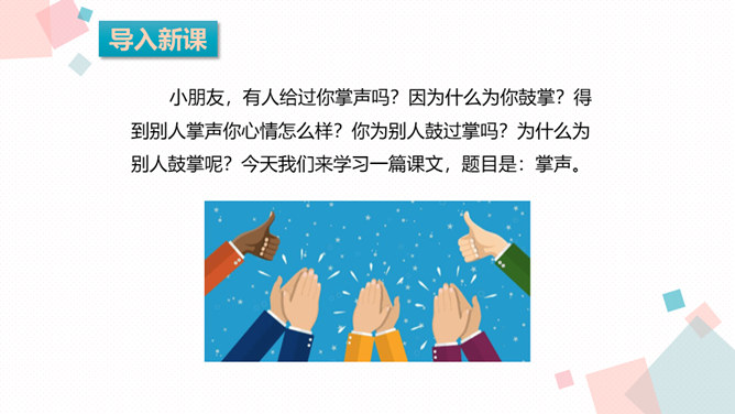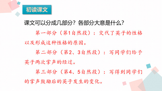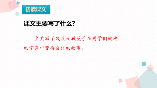 课文主要写了什么?主要写了残疾女孩英子在同学们鼓励的掌声中变得自信的故事。初读课文后,你感受到了什么?读完这篇课文,让我真切地感受到英子是一个积极、乐观,充满面对生活的勇气和自信的人。小朋友,有人给过你掌声吗?因为什么为你鼓掌?得到别人掌声你心情怎么样?你为别人鼓过掌吗?为什么为别人鼓掌呢?今天我们来学习一篇课文,题目是:掌声。会认13个生字,会写11个生字。正确、流利、有感情地朗读课文,初步感知文意。